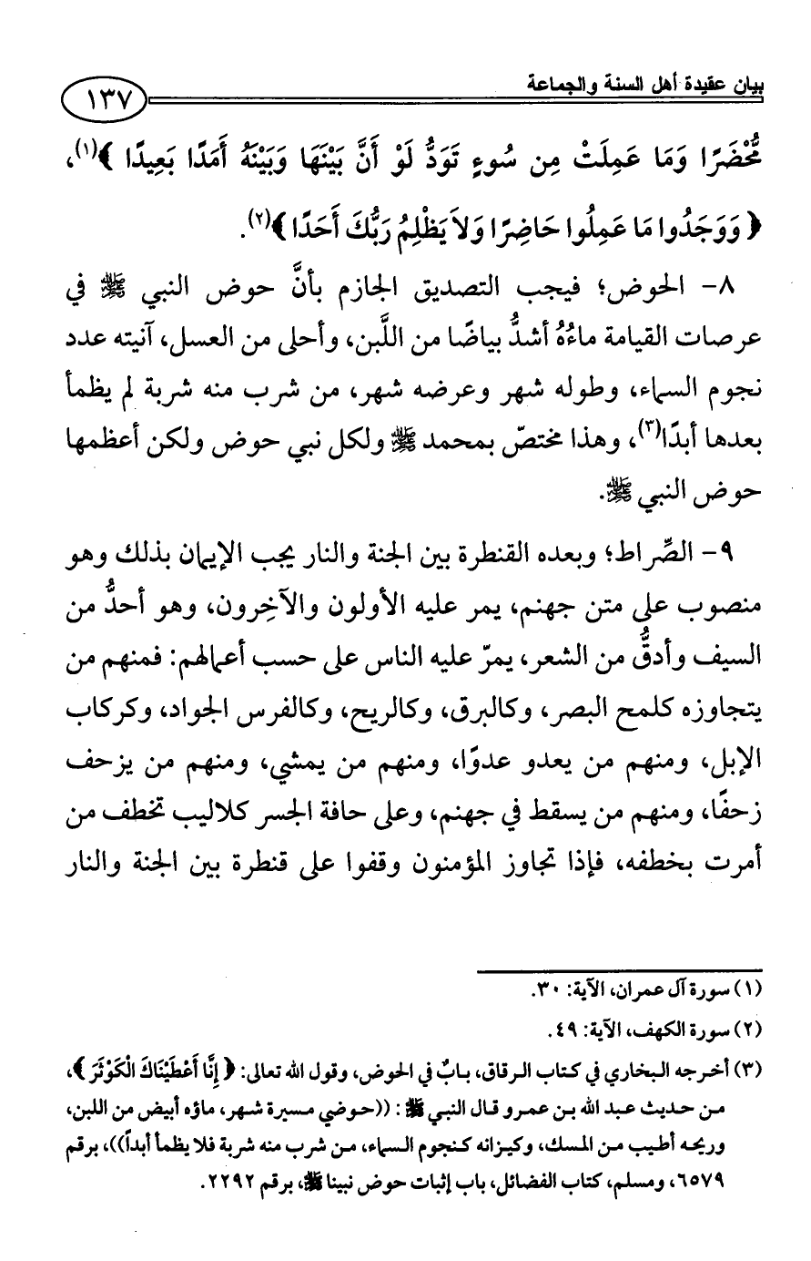 9 - الصِّراط؛ وبعده القنطرة بين الجنة والنار يجب الإيمان بذلك وهو منصوب على متن جهنم، يمر عليه الأولون والآخِرون، وهو أحدُّ من السيف وأدقُّ من الشعر، يمرّ عليه الناس على حسب أعمالهم: فمنهم من يتجاوزه كلمح البصر، وكالبرق، وكالريح، وكالفرس الجواد، وكركاب الإبل، ومنهم من يعدو عدوًا، ومنهم من يمشي، ومنهم من يزحف زحفًا، ومنهم من يسقط في جهنم، وعلى حافة الجسر كلاليب تخطف من أمرت بخطفه، فإذا تجاوز المؤمنون وقفوا على قنطرة بين الجنة والنار