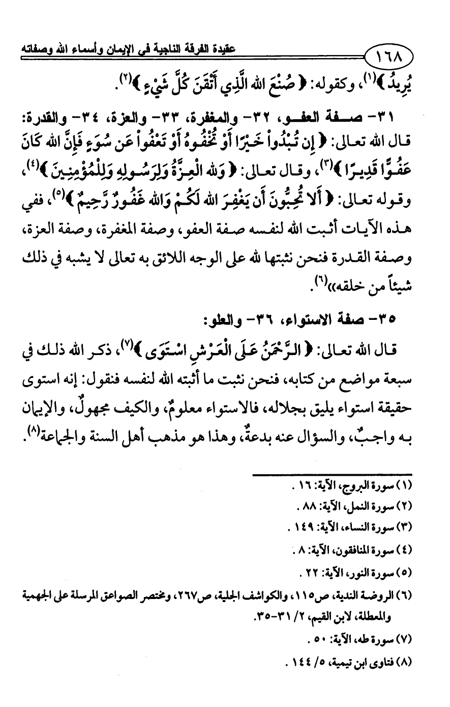 31 - صفة العفو، 32 - والمغفرة، 33 - والعزة، 34 - والقدرة: قال الله تعالى: {إِن تُبْدُواْ خَيْرًا أَوْ تُخْفُوهُ أَوْ تَعْفُواْ عَن سُوَءٍ فَإِنَّ الله كَانَ عَفُوًّا قَدِيرًا} (¬3)، وقال تعالى: {وَلله الْعِزَّةُ وَلِرَسُولِهِ وَلِلْمُؤْمِنِينَ} (¬4)، وقوله تعالى: {أَلا تُحِبُّونَ أَن يَغْفِرَ الله لَكُمْ وَالله غَفُورٌ رَّحِيمٌ} (¬5)، ففي هذه الآيات أثبت الله لنفسه صفة العفو، وصفة المغفرة، وصفة العزة، وصفة القدرة فنحن نثبتها لله على الوجه اللائق به تعالى لا يشبه في ذلك شيئاً من خلقه)) (¬6).