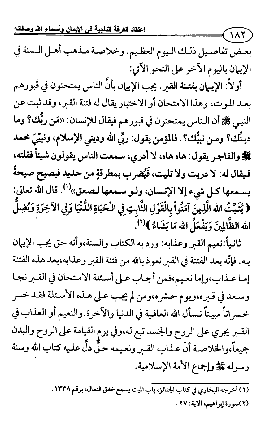 ثانياً: نعيم القبر وعذابه: ورد به الكتاب والسنة، وأنه حق يجب الإيمان به. فإنّه بعد الفتنة في القبر نعوذ بالله من فتنة القبر وعذابه، بعد هذه الفتنة إما عذاب، وإما نعيم، فمن أجاب على أسئلة الامتحان في القبر نجا وسعد في قبره، ويوم حشره، ومن لم يجب على هذه الأسئلة فقد خسر خسراناً مبيناً نسأل الله العافية في الدنيا والآخرة. والنعيم أو العذاب في القبر يجري على الروح والجسد تبع له، وفي يوم القيامة على الروح والبدن جميعاً، والخلاصة أنّ عذاب القبر ونعيمه حقٌّ دلَّ عليه كتاب الله وسنة رسوله - صلى الله عليه وسلم - وإجماع الأمة الإسلامية.