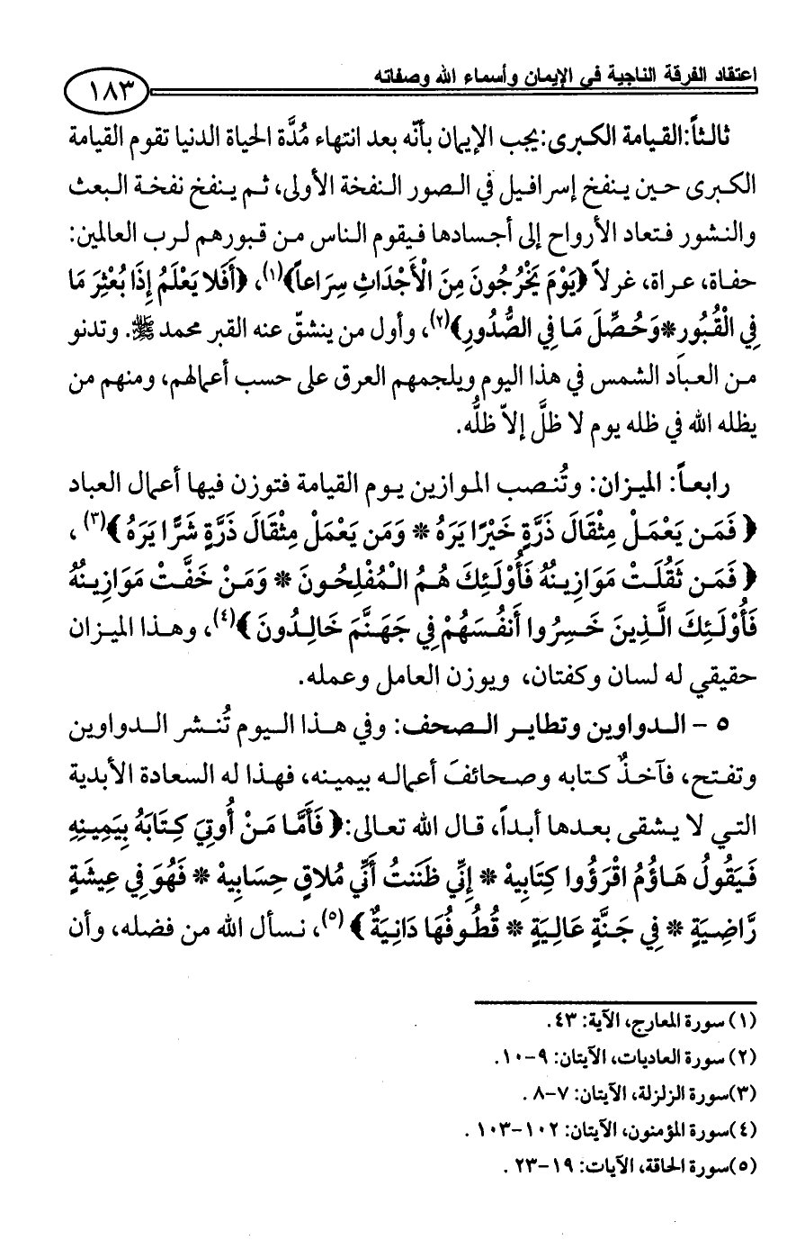 {فَمَن يَعْمَلْ مِثْقَالَ ذَرَّةٍ خَيْرًا يَرَهُ * وَمَن يَعْمَلْ مِثْقَالَ ذَرَّةٍ شَرًّا يَرَهُ} (¬3)، {فَمَن ثَقُلَتْ مَوَازِينُهُ فَأُوْلَئِكَ هُمُ الْمُفْلِحُونَ * وَمَنْ خَفَّتْ مَوَازِينُهُ فَأُوْلَئِكَ الَّذِينَ خَسِرُوا أَنفُسَهُمْ فِي جَهَنَّمَ خَالِدُونَ} (¬4)، وهذا الميزان حقيقي له لسان وكفتان، ويوزن العامل وعمله.