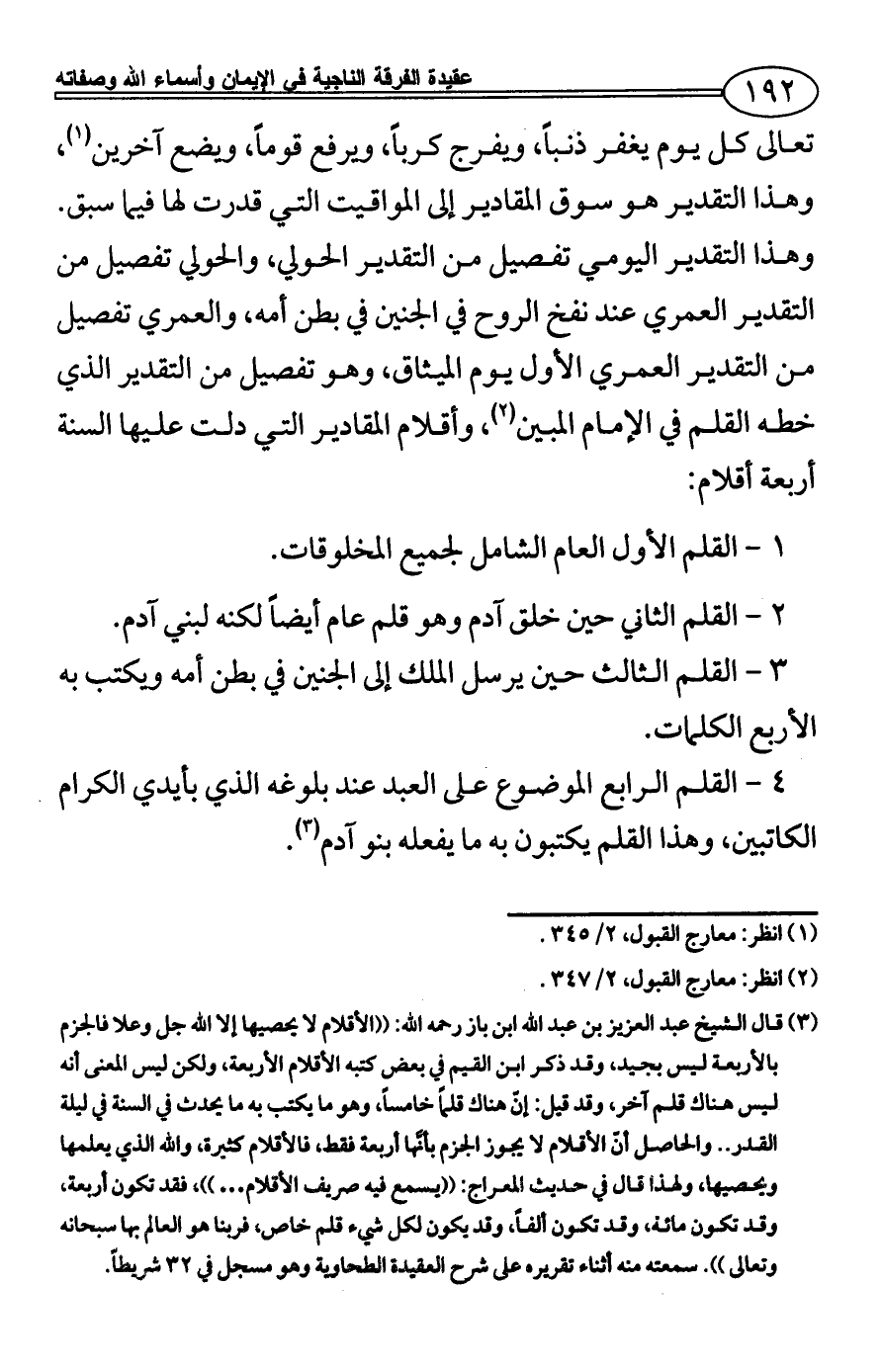 (¬2) قال الشيخ عبد العزيز بن عبد الله ابن باز رحمه الله: ((الأقلام لا يحصيها إلا الله جل وعلا فالجزم بالأربعة ليس بجيد، وقد ذكر ابن القيم في بعض كتبه الأقلام الأربعة، ولكن ليس المعنى أنه ليس هناك قلم آخر، وقد قيل: إنّ هناك قلماً خامساً، وهو ما يكتب به ما يحدث في السنة في ليلة القدر .. والحاصل أنّ الأقلام لا يجوز الجزم بأنَّها أربعة فقط، فالأقلام كثيرة، والله الذي يعلمها ويحصيها، ولهذا قال في حديث المعراج: ((يسمع فيه صريف الأقلام ... ))، فقد تكون أربعة، وقد تكون مائة، وقد تكون ألفاً، وقد يكون لكل شيء قلم خاص، فربنا هو العالم بها - سبحانه وتعالى -)). سمعته منه أثناء تقريره على شرح العقيدة الطحاوية وهو مسجل في 32 شريطاً.