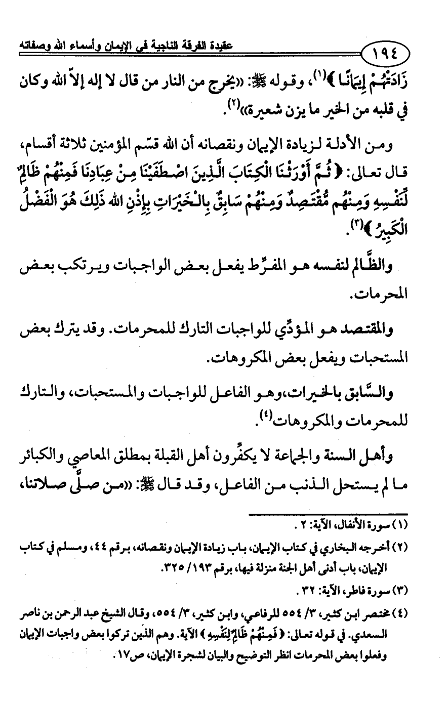 ومن الأدلة لزيادة الإيمان ونقصانه أن الله قسّم المؤمنين ثلاثة أقسام، قال تعالى: {ثُمَّ أَوْرَثْنَا الْكِتَابَ الَّذِينَ اصْطَفَيْنَا مِنْ عِبَادِنَا فَمِنْهُمْ ظَالِمٌ لِّنَفْسِهِ وَمِنْهُم مُّقْتَصِدٌ وَمِنْهُمْ سَابِقٌ بِالْخَيْرَاتِ بِإِذْنِ الله ذَلِكَ هُوَ الْفَضْلُ الْكَبِيرُ} (¬1).