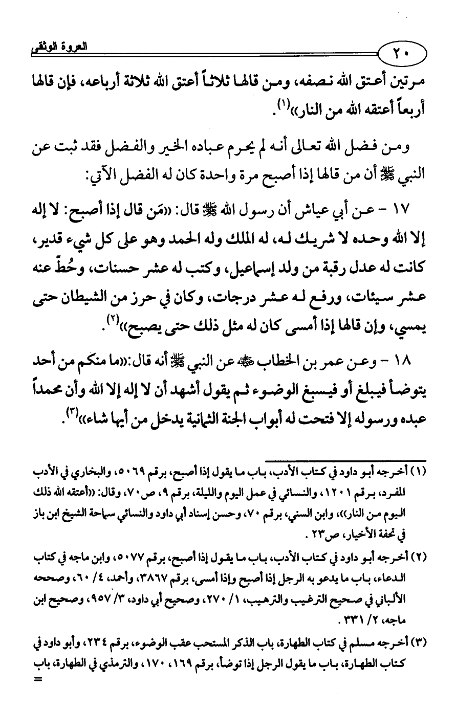 17 - عن أبي عياش أن رسول الله - صلى الله عليه وسلم - قال: ((مَن قال إذا أصبح: لا إله إلا الله وحده لا شريك له، له الملك وله الحمد وهو على كل شيء قدير، كانت له عدل رقبة من ولد إسماعيل، وكتب له عشر حسنات، وحُطّ عنه عشر سيئات، ورفع له عشر درجات، وكان في حرز من الشيطان حتى يمسي، وإن قالها إذا أمسى كان له مثل ذلك حتى يصبح)) (¬1).