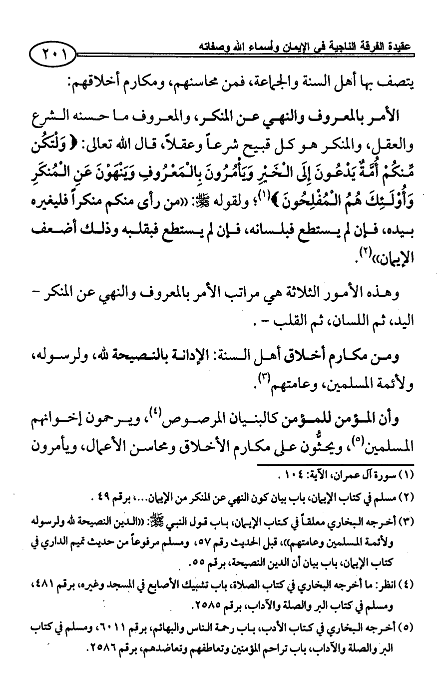 (¬5) أخرجه البخاري في كتاب الاعتصام، باب قول النبي - صلى الله عليه وسلم -: ((لا تزال طائفة من أمتي ظاهرين على الحق)) (رقم 7311)، ومسلم في كتاب الإماة، باب قوله - صلى الله عليه وسلم -: ((لا تزال طائفة من أمتي على الحق لا يضرهم من خالفهم)) (رقم 1920، 1921). وانظر شرح العقيدة الواسطية للهراس ص181 والأسئلة والأجوبة الأصولية ص146.