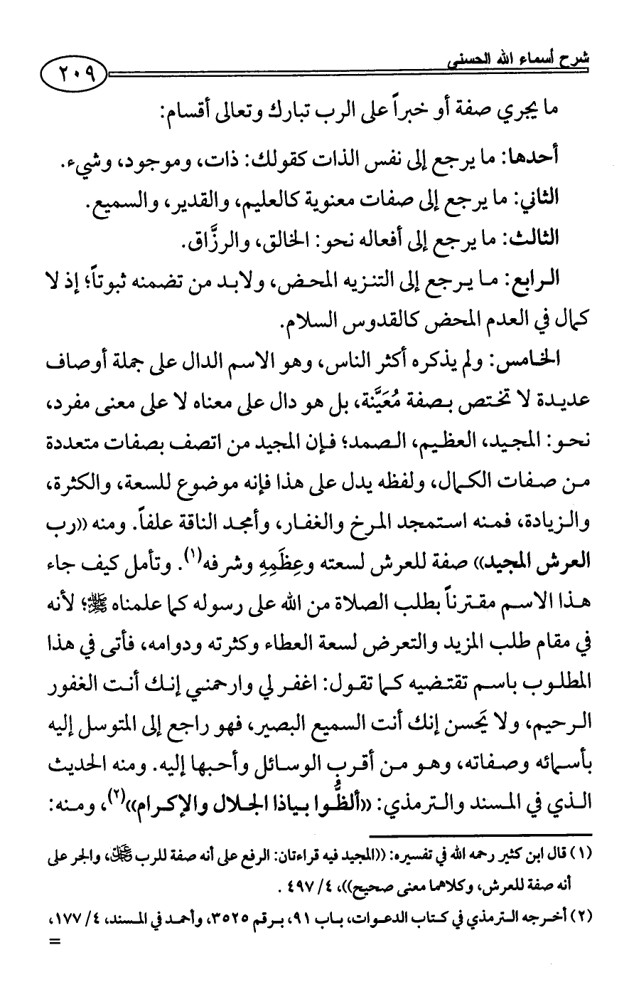الخامس: ولم يذكره أكثر الناس، وهو الاسم الدال على جملة أوصاف عديدة لا تختص بصفة مُعَيَّنة، بل هو دال على معناه لا على معنى مفرد، نحو: المجيد، العظيم، الصمد؛ فإن المجيد من اتصف بصفات متعددة من صفات الكمال، ولفظه يدل على هذا فإنه موضوع للسعة، والكثرة، والزيادة، فمنه استمجد المرخ والغفار، وأمجد الناقة علفاً. ومنه ((رب العرش المجيد)) صفة للعرش لسعته وعِظَمِهِ وشرفه (¬1). وتأمل كيف جاء هذا الاسم مقترناً بطلب الصلاة من الله على رسوله كما علمناه - صلى الله عليه وسلم -؛ لأنه في مقام طلب المزيد والتعرض لسعة العطاء وكثرته ودوامه، فأتى في هذا المطلوب باسم تقتضيه كما تقول: اغفر لي وارحمني إنك أنت الغفور الرحيم، ولا يَحسن إنك أنت السميع البصير، فهو راجع إلى المتوسل إليه بأسمائه وصفاته، وهو من أقرب الوسائل وأحبها إليه. ومنه الحديث الذي في المسند والترمذي: ((ألظُّوا بياذا الجلال والإكرام)) (¬2)، ومنه: