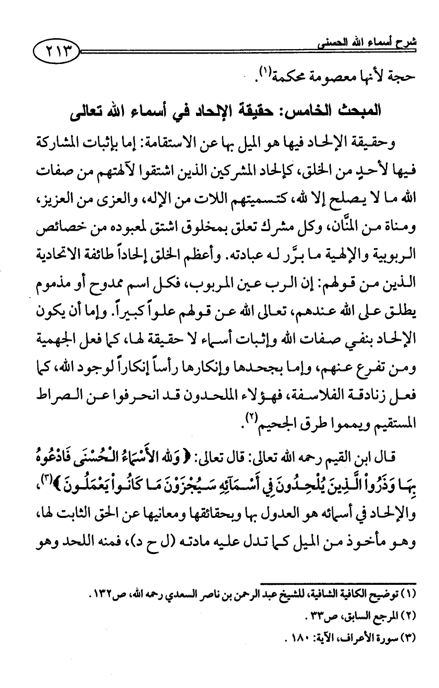 وحقيقة الإلحاد فيها هو الميل بها عن الاستقامة: إما بإثبات المشاركة فيها لأحدٍ من الخلق، كإلحاد المشركين الذين اشتقوا لآلهتهم من صفات الله ما لا يصلح إلا لله، كتسميتهم اللات من الإله، والعزى من العزيز، ومناة من المنَّان، وكل مشرك تعلق بمخلوق اشتق لمعبوده من خصائص الربوبية والإلهية ما برَّر له عبادته. وأعظم الخلق إلحاداً طائفة الاتحادية الذين من قولهم: إن الرب عين المربوب، فكل اسم ممدوح أو مذموم يطلق على الله عندهم، تعالى الله عن قولهم علواً كبيراً. وإما أن يكون الإلحاد بنفي صفات الله وإثبات أسماء لا حقيقة لها، كما فعل الجهمية ومن تفرع عنهم، وإما بجحدها وإنكارها رأساً إنكاراً لوجود الله، كما فعل زنادقة الفلاسفة، فهؤلاء الملحدون قد انحرفوا عن الصراط المستقيم ويمموا طرق الجحيم (¬2).