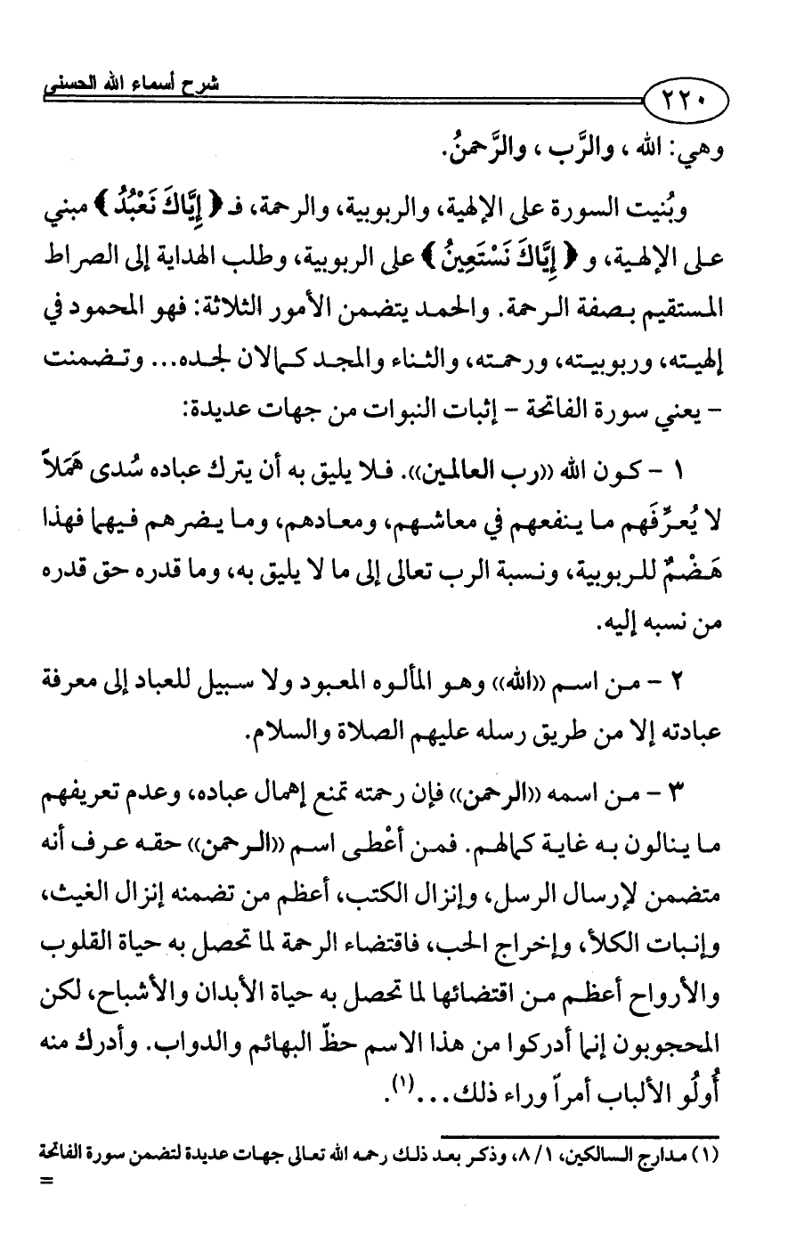 (¬1) مدارج السالكين، 1/ 8، وذكر بعد ذلك رحمه الله تعالى جهات عديدة لتضمن سورة الفاتحة لإثبات النبوات ولكني أقتصر على ما يختص بالأسماء الحُسنى.