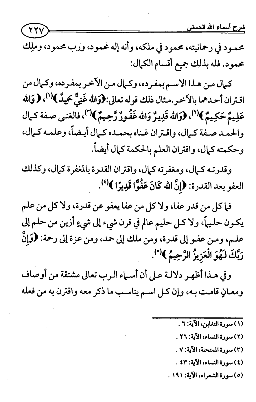 كمال من هذا الاسم بمفرده، وكمال من الآخر بمفرده، وكمال من اقتران أحدهما بالآخر. مثال ذلك قوله تعالى: {وَالله غَنِيٌّ حَمِيدٌ} (¬1)، {وَالله عَلِيمٌ حَكِيمٌ} (¬2)، {وَالله قَدِيرٌ وَالله غَفُورٌ رَّحِيمٌ} (¬3)، فالغنى صفة كمال والحمد صفة كمال، واقتران غناه بحمده كمال أيضاً، وعلمه كمال، وحكمته كمال، واقتران العلم بالحكمة كمال أيضاً.