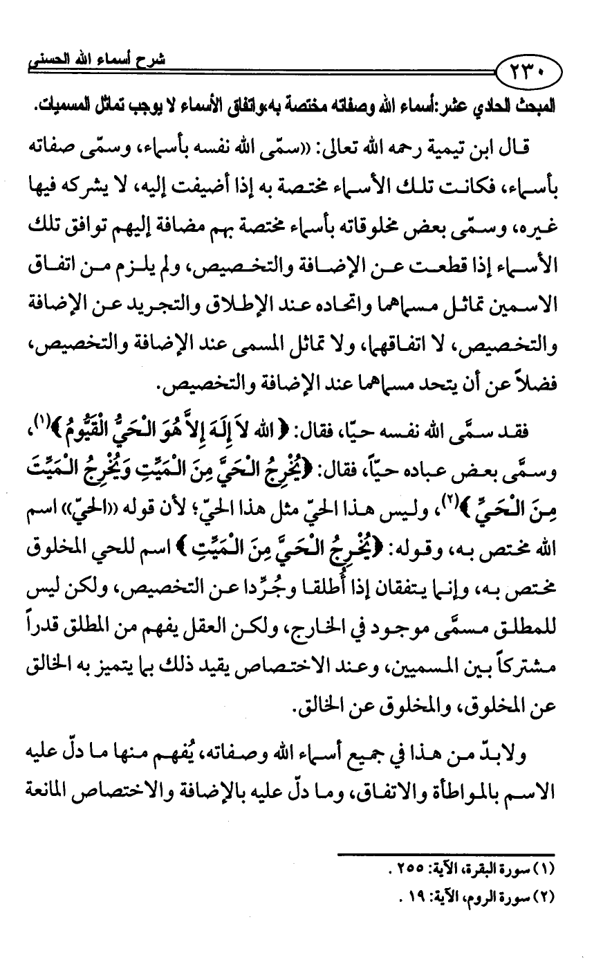 قال ابن تيمية رحمه الله تعالى: ((سمّى الله نفسه بأسماء، وسمّى صفاته بأسماء، فكانت تلك الأسماء مختصة به إذا أضيفت إليه، لا يشركه فيها غيره، وسمّى بعض مخلوقاته بأسماء مختصة بهم مضافة إليهم توافق تلك الأسماء إذا قطعت عن الإضافة والتخصيص، ولم يلزم من اتفاق الاسمين تماثل مسماهما واتحاده عند الإطلاق والتجريد عن الإضافة والتخصيص، لا اتفاقهما، ولا تماثل المسمى عند الإضافة والتخصيص، فضلاً عن أن يتحد مسماهما عند الإضافة والتخصيص.