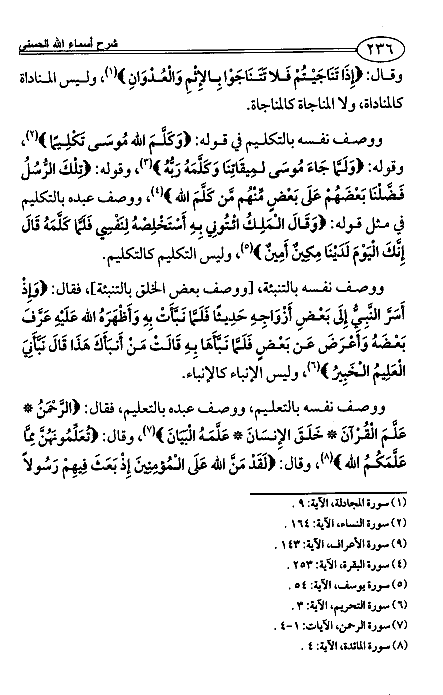 ووصف نفسه بالتكليم في قوله: {وَكَلَّمَ الله مُوسَى تَكْلِيمًا} (¬2)، وقوله: {وَلَمَّا جَاءَ مُوسَى لمِيقَاتِنَا وَكَلَّمَهُ رَبُّهُ} (¬3)، وقوله: {تِلْكَ الرُّسُلُ فَضَّلْنَا بَعْضَهُمْ عَلَى بَعْضٍ مِّنْهُم مَّن كَلَّمَ الله} (¬4)، ووصف عبده بالتكليم في مثل قوله: {وَقَالَ الْمَلِكُ ائْتُونِي بِهِ أَسْتَخْلِصْهُ لِنَفْسِي فَلَمَّا كَلَّمَهُ قَالَ إِنَّكَ الْيَوْمَ لَدَيْنَا مِكِينٌ أَمِينٌ} (¬5)، وليس التكليم كالتكليم.