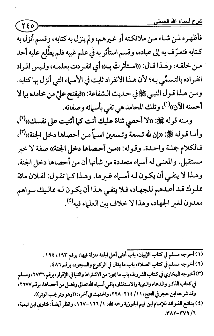 (¬3) أخرجه البخاري في كتاب الشروط، باب ما يجوز من الاشتراط والثنيا في الإقرار، برقم 2736، ومسلم في كتاب الذكر والدعاء والتوبة والاستغفار، باقي أسماء الله تعالى وفضل من أحصاها، برقم 2677، وقد شرحه ابن حجر في الفتح، 11/ 214 - 228، والحديث في آخره: ((وهو وتر يحب الوتر)).