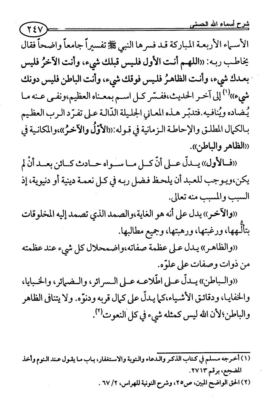 الأسماء الأربعة المباركة قد فسرها النبي - صلى الله عليه وسلم - تفسيراً جامعاً واضحاً فقال يخاطب ربه: ((اللهم أنت الأول فليس قبلك شيء، وأنت الآخرُ فليس بعدك شيء، وأنت الظاهرُ فليس فوقك شيء، وأنت الباطن فليس دونك شيء)) (¬1) إلى آخر الحديث، ففسّر كل اسم بمعناه العظيم، ونفى عنه ما يُضاده ويُنافيه. فتدبّر هذه المعاني الجليلة الدّالة على تفرّد الرب العظيم بالكمال المطلق والإحاطة الزمانية في قوله: ((الأوّلُ والآخرُ))،والمكانية في ((الظاهر والباطن)).