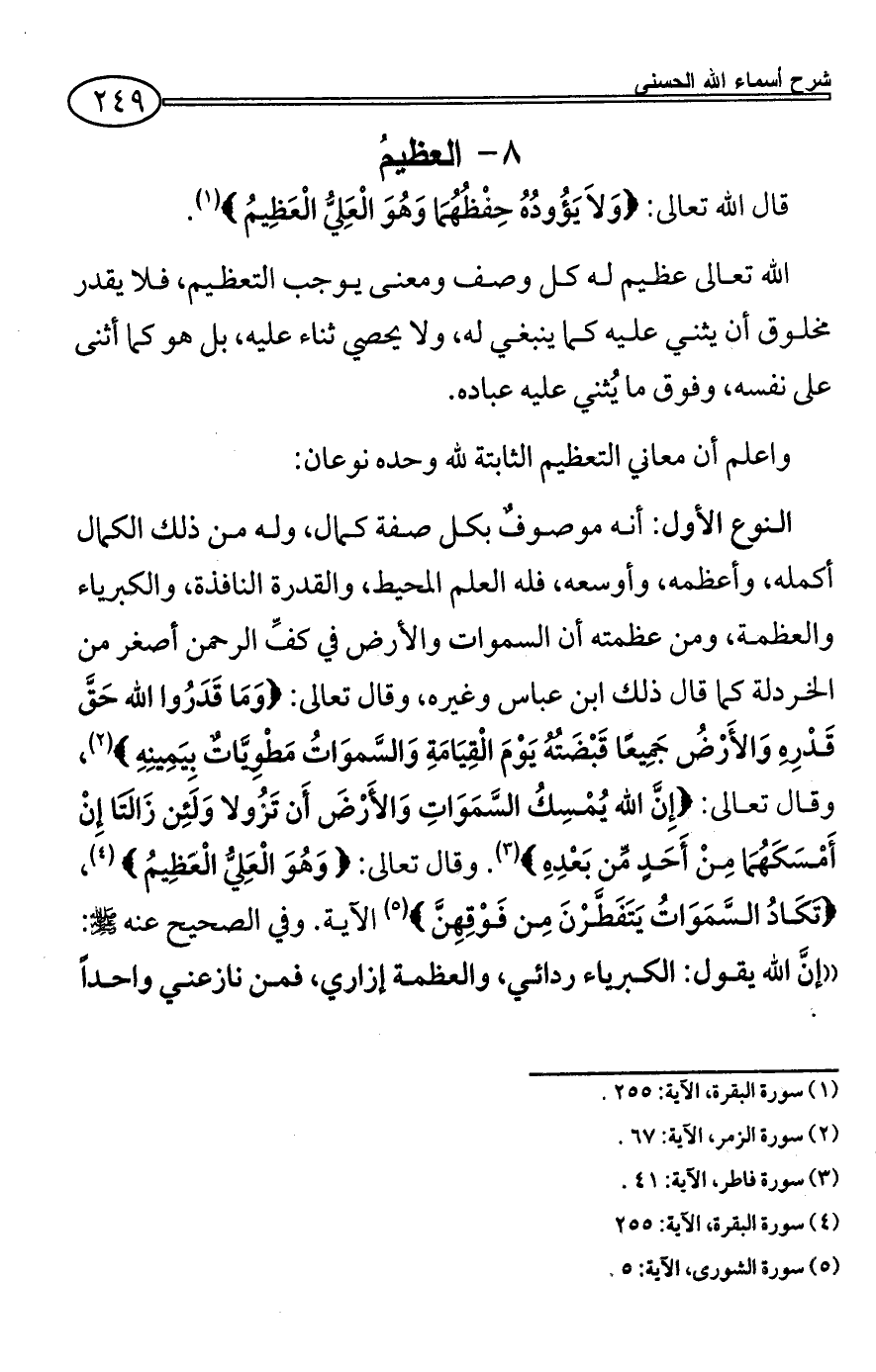 قال الله تعالى: {وَلاَ يَؤُودُهُ حِفْظُهُمَا وَهُوَ الْعَلِيُّ الْعَظِيمُ} (¬1).
