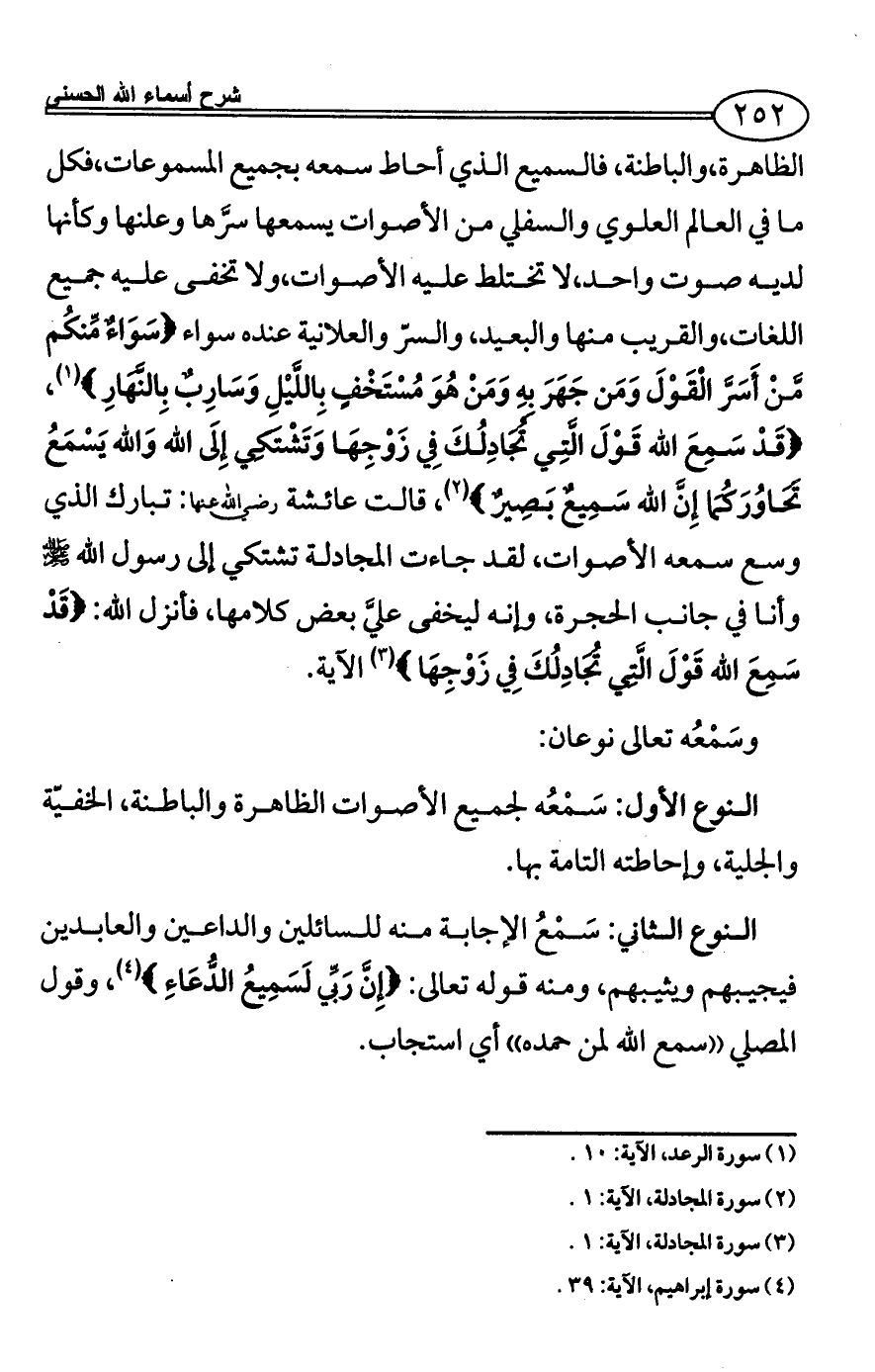 الظاهرة، والباطنة، فالسميع الذي أحاط سمعه بجميع المسموعات، فكل ما في العالم العلوي والسفلي من الأصوات يسمعها سرَّها وعلنها وكأنها لديه صوت واحد، لا تختلط عليه الأصوات، ولا تخفى عليه جميع اللغات، والقريب منها والبعيد، والسرّ والعلانية عنده سواء {سَوَاءٌ مِّنكُم مَّنْ أَسَرَّ الْقَوْلَ وَمَن جَهَرَ بِهِ وَمَنْ هُوَ مُسْتَخْفٍ بِاللَّيْلِ وَسَارِبٌ بِالنَّهَارِ} (¬1)، {قَدْ سَمِعَ الله قَوْلَ الَّتِي تُجَادِلُكَ فِي زَوْجِهَا وَتَشْتَكِي إِلَى الله وَالله يَسْمَعُ تَحَاوُرَكُمَا إِنَّ الله سَمِيعٌ بَصِيرٌ} (¬2)، قالت عائشة رضي الله عنها: تبارك الذي وسع سمعه الأصوات، لقد جاءت المجادلة تشتكي إلى رسول الله - صلى الله عليه وسلم - وأنا في جانب الحجرة، وإنه ليخفى عليَّ بعض كلامها، فأنزل الله: {قَدْ سَمِعَ الله قَوْلَ الَّتِي تُجَادِلُكَ فِي زَوْجِهَا} (¬3) الآية.