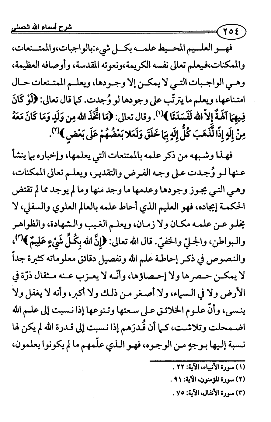 فهو العليم المحيط علمه بكل شيء: بالواجبات، والممتنعات، والممكنات، فيعلم تعالى نفسه الكريمة، ونعوته المقدسة، وأوصافه العظيمة، وهي الواجبات التي لا يمكن إلا وجودها، ويعلم الممتنعات حال امتناعها، ويعلم ما يترتّب على وجودها لو وُجدت. كما قال تعالى: {لَوْ كَانَ فِيهِمَا آلهَةٌ إِلاّ الله لَفَسَدَتَا} (¬1). وقال تعالى: {مَا اتَّخَذَ الله مِن وَلَدٍ وَمَا كَانَ مَعَهُ مِنْ إِلَهٍ إِذًا لَّذَهَبَ كُلُّ إِلَهٍ بِمَا خَلَقَ وَلَعَلا بَعْضُهُمْ عَلَى بَعْضٍ} (¬2).