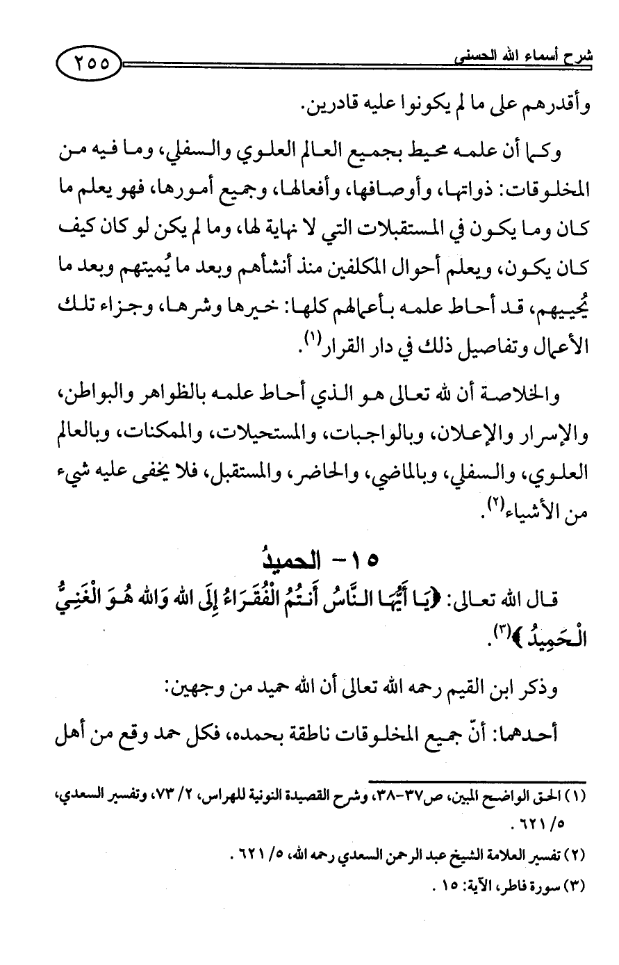 وكما أن علمه محيط بجميع العالم العلوي والسفلي، وما فيه من المخلوقات: ذواتها، وأوصافها، وأفعالها، وجميع أمورها، فهو يعلم ما كان وما يكون في المستقبلات التي لا نهاية لها، وما لم يكن لو كان كيف كان يكون، ويعلم أحوال المكلفين منذ أنشأهم وبعد ما يُميتهم وبعد ما يُحييهم، قد أحاط علمه بأعمالهم كلها: خيرها وشرها، وجزاء تلك الأعمال وتفاصيل ذلك في دار القرار (¬1).