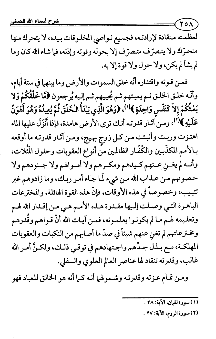 فمن قوته واقتداره أنّه خلق السموات والأرض وما ببينهما في ستة أيام، وأنّه خلق الخلق ثم يميتهم ثم يُحييهم ثم إليه يُرجعون {مَّا خَلْقُكُمْ وَلا بَعْثُكُمْ إِلاّ كَنَفْسٍ وَاحِدَةٍ} (¬1)، {وَهُوَ الَّذِي يَبْدَأُ الْخَلْقَ ثُمَّ يُعِيدُهُ وَهُوَ أَهْوَنُ عَلَيْهِ} (¬2)، ومن آثار قدرته أنك ترى الأرض هامدة، فإذا أنزل عليها الماء اهتزت وربت وأنبتت من كل زوج بهيج، ومن آثار قدرته ما أوقعه بالأمم المكذّبين والكُفّار الظالمين من أنواع العقوبات وحلول المثلات، وأنه لم يغنِ عنهم كيدهم ومكرهم ولا أموالهم ولا جنودهم ولا حصونهم من عذاب الله من شيء لمّا جاء أمر ربك، وما زادوهم غير تتبيب، وخصوصاً في هذه الأوقات، فإنّ هذه القوة الهائلة، والمخترعات الباهرة التي وصلت إليها مقدرة هذه الأمم هي من إقدار الله لهم وتعليمه لهم ما لم يكونوا يعلمونه، فمن آيات الله أنّ قواهم وقُدرهم ومخترعاتهم لم تغنِ عنهم شيئاً في صدّ ما أصابهم من النكبات والعقوبات المهلكة، مع بذل جدِّهم واجتهادهم في توقي ذلك، ولكنَّ أمر الله غالب، وقدرته تنقاد لها عناصر العالم العلوي والسفلي.