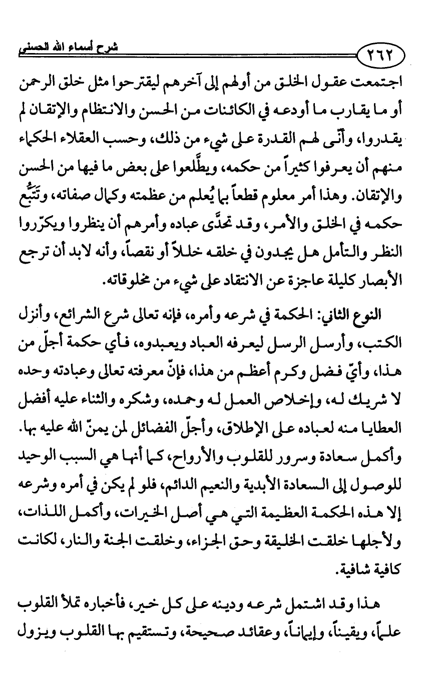 النوع الثاني: الحكمة في شرعه وأمره، فإنه تعالى شرع الشرائع، وأنزل الكتب، وأرسل الرسل ليعرفه العباد ويعبدوه، فأي حكمة أجلّ من هذا، وأيّ فضل وكرم أعظم من هذا، فإنّ معرفته تعالى وعبادته وحده لا شريك له، وإخلاص العمل له وحمده، وشكره والثناء عليه أفضل العطايا منه لعباده على الإطلاق، وأجلّ الفضائل لمن يمنّ الله عليه بها. وأكمل سعادة وسرور للقلوب والأرواح، كما أنها هي السبب الوحيد للوصول إلى السعادة الأبدية والنعيم الدائم، فلو لم يكن في أمره وشرعه إلا هذه الحكمة العظيمة التي هي أصل الخيرات، وأكمل اللذات، ولأجلها خلقت الخليقة وحق الجزاء، وخلقت الجنة والنار، لكانت كافية شافية.