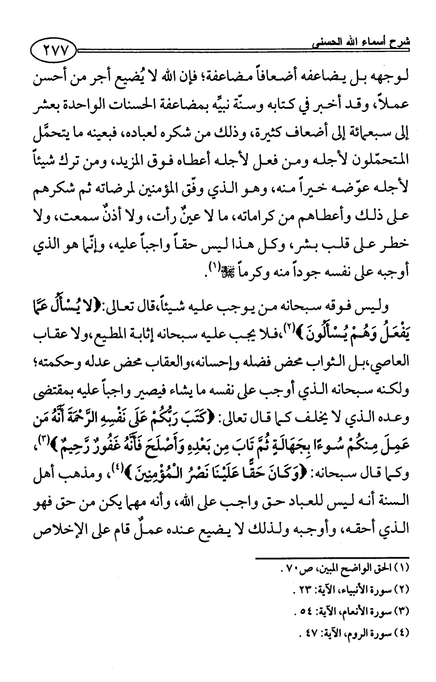 وليس فوقه سبحانه من يوجب عليه شيئاً، قال تعالى: {لا يُسْأَلُ عَمَّا يَفْعَلُ وَهُمْ يُسْأَلُونَ} (¬2)،فلا يجب عليه سبحانه إثابة المطيع، ولا عقاب العاصي، بل الثواب محض فضله وإحسانه، والعقاب محض عدله وحكمته؛ ولكنه سبحانه الذي أوجب على نفسه ما يشاء فيصير واجباً عليه بمقتضى وعده الذي لا يخلف كما قال تعالى: {كَتَبَ رَبُّكُمْ عَلَى نَفْسِهِ الرَّحْمَةَ أَنَّهُ مَن عَمِلَ مِنكُمْ سُوءًا بِجَهَالَةٍ ثُمَّ تَابَ مِن بَعْدِهِ وَأَصْلَحَ فَأَنَّهُ غَفُورٌ رَّحِيمٌ} (¬3)، وكما قال سبحانه: {وَكَانَ حَقًّا عَلَيْنَا نَصْرُ الْمُؤْمِنِينَ} (¬4)، ومذهب أهل السنة أنه ليس للعباد حق واجب على الله، وأنه مهما يكن من حق فهو الذي أحقه، وأوجبه ولذلك لا يضيع عنده عملٌ قام على الإخلاص