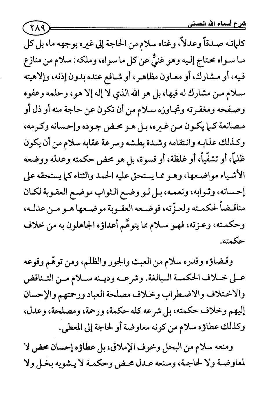 وقضاؤه وقدره سلام من العبث والجور والظلم، ومن توهّم وقوعه على خلاف الحكمة البالغة. وشرعه ودينه سلام من التناقض والاختلاف والاضطراب وخلاف مصلحة العباد ورحمتهم والإحسان إليهم وخلاف حكمته، بل شرعه كله حكمة، ورحمة، ومصلحة، وعدل، وكذلك عطاؤه سلام من كونه معاوضة أو لحاجة إلى المعطى.