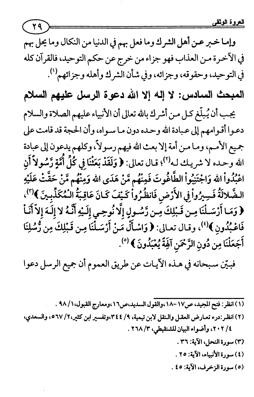 {وَمَا أَرْسَلْنَا مِن قَبْلِكَ مِن رَّسُولٍ إِلَّا نُوحِي إِلَيْهِ أَنَّهُ لا إِلَهَ إِلاّ أَنَاْ فَاعْبُدُونِ} (¬3)، وقال تعالى: {وَاسْأَلْ مَنْ أَرْسَلْنَا مِن قَبْلِكَ مِن رُّسُلِنَا أَجَعَلْنَا مِن دُونِ الرَّحْمَنِ آلِهَةً يُعْبَدُونَ} (¬4).