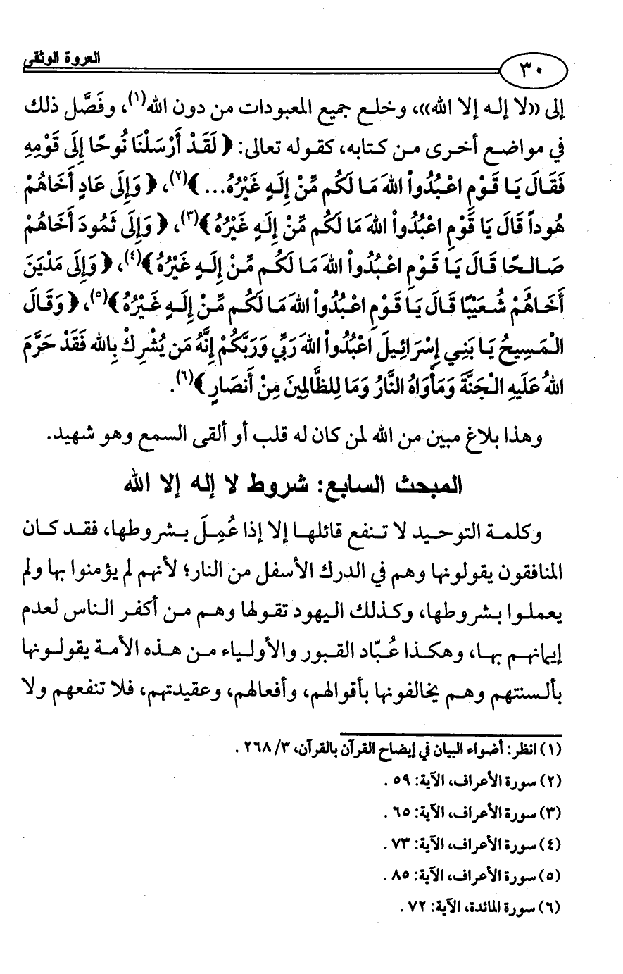 وكلمة التوحيد لا تنفع قائلها إلا إذا عُمِلَ بشروطها، فقد كان المنافقون يقولونها وهم في الدرك الأسفل من النار؛ لأنهم لم يؤمنوا بها ولم يعملوا بشروطها، وكذلك اليهود تقولها وهم من أكفر الناس لعدم إيمانهم بها، وهكذا عُبّاد القبور والأولياء من هذه الأمة يقولونها بألسنتهم وهم يخالفونها بأقوالهم، وأفعالهم، وعقيدتهم، فلا تنفعهم ولا يكونون بقولها مسلمين؛ لأنهم ناقضوها بأقوالهم، وأعمالهم، وعقائدهم؛ ولهذا ذكر بعض أهل العلم لها سبعة شروط (¬5) ونظمها بعضهم بقوله: