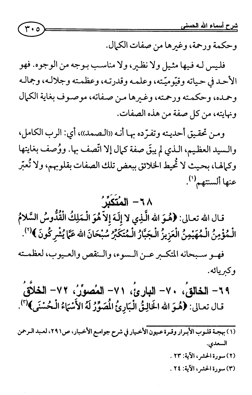قال الله تعالى: {هُوَ الله الَّذِي لا إِلَهَ إِلاّ هُوَ الْمَلِكُ الْقُدُّوسُ السَّلامُ الْمُؤْمِنُ الْمُهَيْمِنُ الْعَزِيزُ الْجَبَّارُ الْمُتَكَبِّرُ سُبْحَانَ الله عَمَّا يُشْرِكُونَ} (¬2).