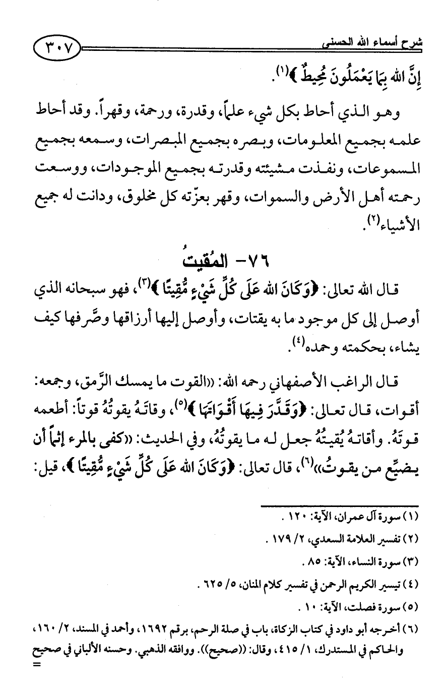 قال الله تعالى: {وَكَانَ الله عَلَى كُلِّ شَيْءٍ مُّقِيتًا} (¬3)، فهو سبحانه الذي أوصل إلى كل موجود ما به يقتات، وأوصل إليها أرزاقها وصَّرفها كيف يشاء، بحكمته وحمده (¬4).