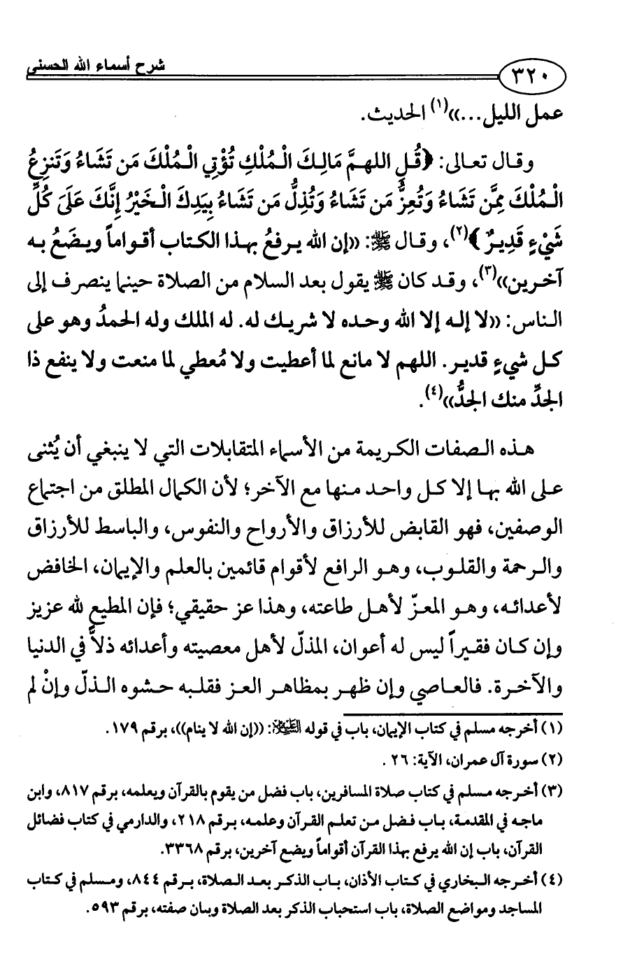 وقال تعالى: {قُلِ اللهمَّ مَالِكَ الْمُلْكِ تُؤْتِي الْمُلْكَ مَن تَشَاءُ وَتَنزِعُ الْمُلْكَ مِمَّن تَشَاءُ وَتُعِزُّ مَن تَشَاءُ وَتُذِلُّ مَن تَشَاءُ بِيَدِكَ الْخَيْرُ إِنَّكَ عَلَىَ كُلِّ شَيْءٍ قَدِيرٌ} (¬2)، وقال - صلى الله عليه وسلم -: ((إن الله يرفعُ بهذا الكتاب أقواماً ويضَعُ به آخرين)) (¬3)، وقد كان - صلى الله عليه وسلم - يقول بعد السلام من الصلاة حينما ينصرف إلى الناس: ((لا إله إلا الله وحده لا شريك له. له الملك وله الحمدُ وهو على كل شيءٍ قدير. اللهم لا مانع لما أعطيت ولا مُعطي لما منعت ولا ينفع ذا الجدِّ منك الجدُّ)) (¬4).