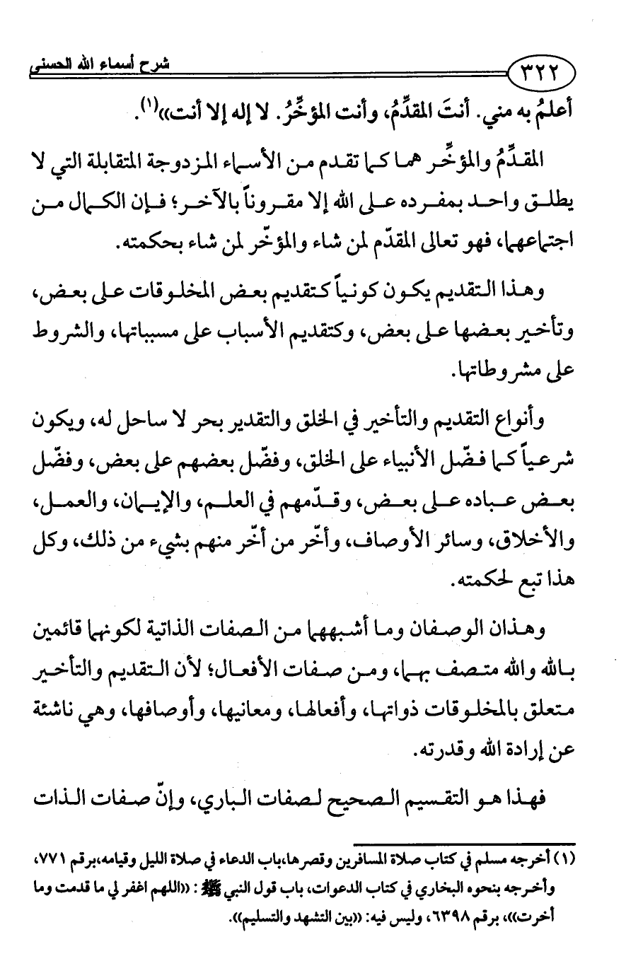 وهذان الوصفان وما أشبههما من الصفات الذاتية لكونهما قائمين بالله والله متصف بهما، ومن صفات الأفعال؛ لأن التقديم والتأخير متعلق بالمخلوقات ذواتها، وأفعالها، ومعانيها، وأوصافها، وهي ناشئة عن إرادة الله وقدرته.