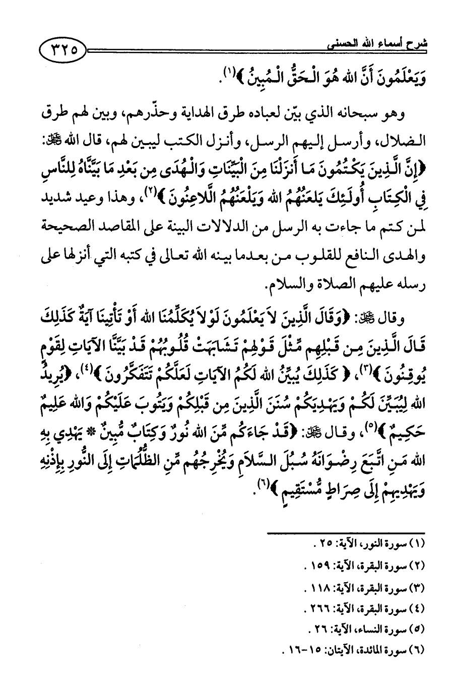 وقال - عز وجل -: {وَقَالَ الَّذِينَ لاَ يَعْلَمُونَ لَوْلاَ يُكَلِّمُنَا الله أَوْ تَأْتِينَا آيَةٌ كَذَلِكَ قَالَ الَّذِينَ مِن قَبْلِهِم مِّثْلَ قَوْلِهِمْ تَشَابَهَتْ قُلُوبُهُمْ قَدْ بَيَّنَّا الآيَاتِ لِقَوْمٍ يُوقِنُونَ} (¬3)، {كَذَلِكَ يُبيِّنُ الله لَكُمُ الآيَاتِ لَعَلَّكُمْ تَتَفَكَّرُونَ} (¬4)، {يُرِيدُ الله لِيُبَيِّنَ لَكُمْ وَيَهْدِيَكُمْ سُنَنَ الَّذِينَ مِن قَبْلِكُمْ وَيَتُوبَ عَلَيْكُمْ وَالله عَلِيمٌ حَكِيمٌ} (¬5)، وقال - عز وجل -: {قَدْ جَاءَكُم مِّنَ الله نُورٌ وَكِتَابٌ مُّبِينٌ * يَهْدِي بِهِ الله مَنِ اتَّبَعَ رِضْوَانَهُ سُبُلَ السَّلاَمِ وَيُخْرِجُهُم مِّنِ الظُّلُمَاتِ إِلَى النُّورِ بِإِذْنِهِ وَيَهْدِيهِمْ إِلَى صِرَاطٍ مُّسْتَقِيمٍ} (¬6).