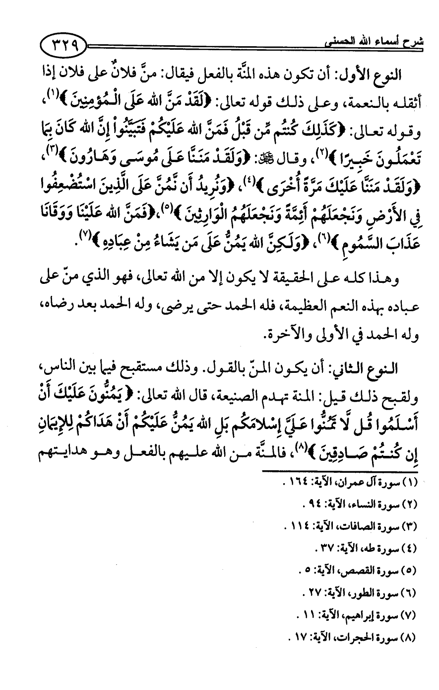 النوع الثاني: أن يكون المنّ بالقول. وذلك مستقبح فيما بين الناس، ولقبح ذلك قيل: المنة تهدم الصنيعة، قال الله تعالى: {يَمُنُّونَ عَلَيْكَ أَنْ أَسْلَمُوا قُل لَّا تَمُنُّوا عَلَيَّ إِسْلامَكُم بَلِ الله يَمُنُّ عَلَيْكُمْ أَنْ هَدَاكُمْ لِلإِيمَانِ إِن كُنتُمْ صَادِقِينَ} (¬8)، فالمنَّة من الله عليهم بالفعل وهو هدايتهم