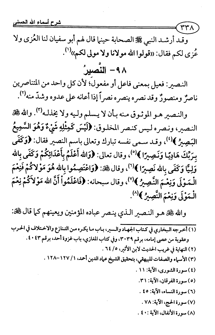 والنصير هو الموثوق منه بأن لا يسلم وليه ولا يخذله (¬3). والله - عز وجل - النصير، ونصره ليس كنصر المخلوق: {لَيْسَ كَمِثْلِهِ شَيْءٌ وَهُوَ السَّمِيعُ البَصِيرُ} (¬4)، وقد سمى نفسه تبارك وتعالى باسم النصير فقال: {وَكَفَى بِرَبِّكَ هَادِيًا وَنَصِيرًا} (¬5)، وقال تعالى: {وَالله أَعْلَمُ بِأَعْدَائِكُمْ وَكَفَى بِالله وَلِيًّا وَكَفَى بِالله نَصِيرًا} (¬6)، وقال - عز وجل -: {وَاعْتَصِمُوا بِالله هُوَ مَوْلاكُمْ فَنِعْمَ الْمَوْلَى وَنِعْمَ النَّصِيرُ} (¬7)، وقال سبحانه: {فَاعْلَمُواْ أَنَّ الله مَوْلاَكُمْ نِعْمَ الْمَوْلَى وَنِعْمَ النَّصِيرُ} (¬8).