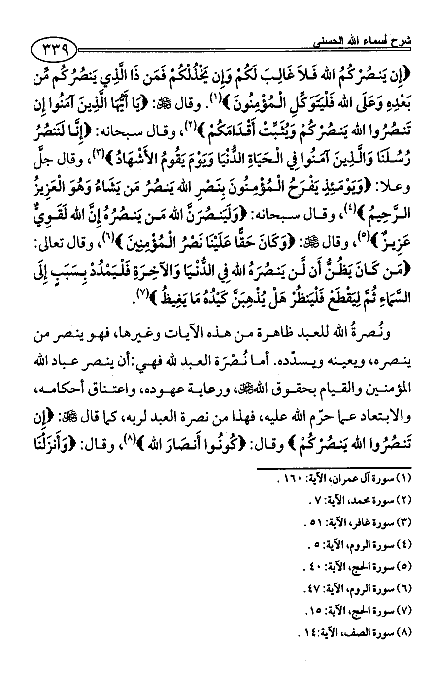 {إِن يَنصُرْكُمُ الله فَلاَ غَالِبَ لَكُمْ وَإِن يَخْذُلْكُمْ فَمَن ذَا الَّذِي يَنصُرُكُم مِّن بَعْدِهِ وَعَلَى الله فَلْيَتَوَكِّلِ الْمُؤْمِنُونَ} (¬1). وقال - عز وجل -: {يَا أَيُّهَا الَّذِينَ آمَنُوا إِن تَنصُرُوا الله يَنصُرْكُمْ وَيُثَبِّتْ أَقْدَامَكُمْ} (¬2)، وقال سبحانه: {إِنَّا لَنَنصُرُ رُسُلَنَا وَالَّذِينَ آمَنُوا فِي الْحَيَاةِ الدُّنْيَا وَيَوْمَ يَقُومُ الأَشْهَادُ} (¬3)، وقال جلَّ وعلا: {وَيَوْمَئِذٍ يَفْرَحُ الْمُؤْمِنُونَ بِنَصْرِ الله يَنصُرُ مَن يَشَاءُ وَهُوَ الْعَزِيزُ الرَّحِيمُ} (¬4)، وقال سبحانه: {وَلَيَنصُرَنَّ الله مَن يَنصُرُهُ إِنَّ الله لَقَوِيٌّ