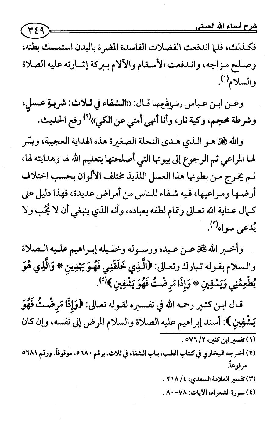 وأخبر الله - عز وجل - عن عبده ورسوله وخليله إبراهيم عليه الصلاة والسلام بقوله تبارك وتعالى: {الَّذِي خَلَقَنِي فَهُوَ يَهْدِينِ * وَالَّذِي هُوَ يُطْعِمُنِي وَيَسْقِينِ * وَإِذَا مَرِضْتُ فَهُوَ يَشْفِينِ} (¬4).