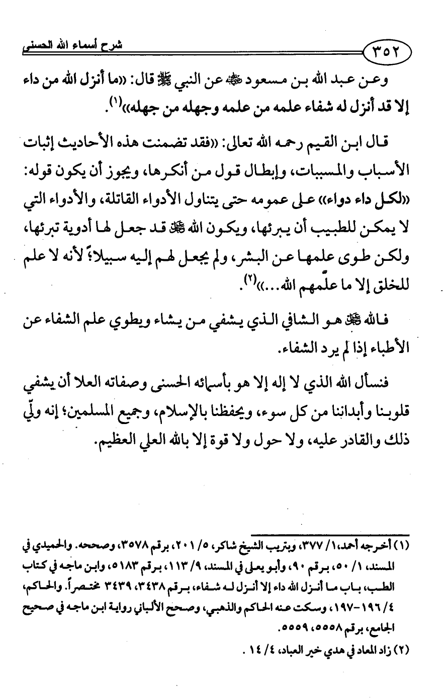 وعن عبد الله بن مسعود - رضي الله عنه - عن النبي - صلى الله عليه وسلم - قال: ((ما أنزل الله من داء إلا قد أنزل له شفاء علمه من علمه وجهله من جهله)) (¬1).