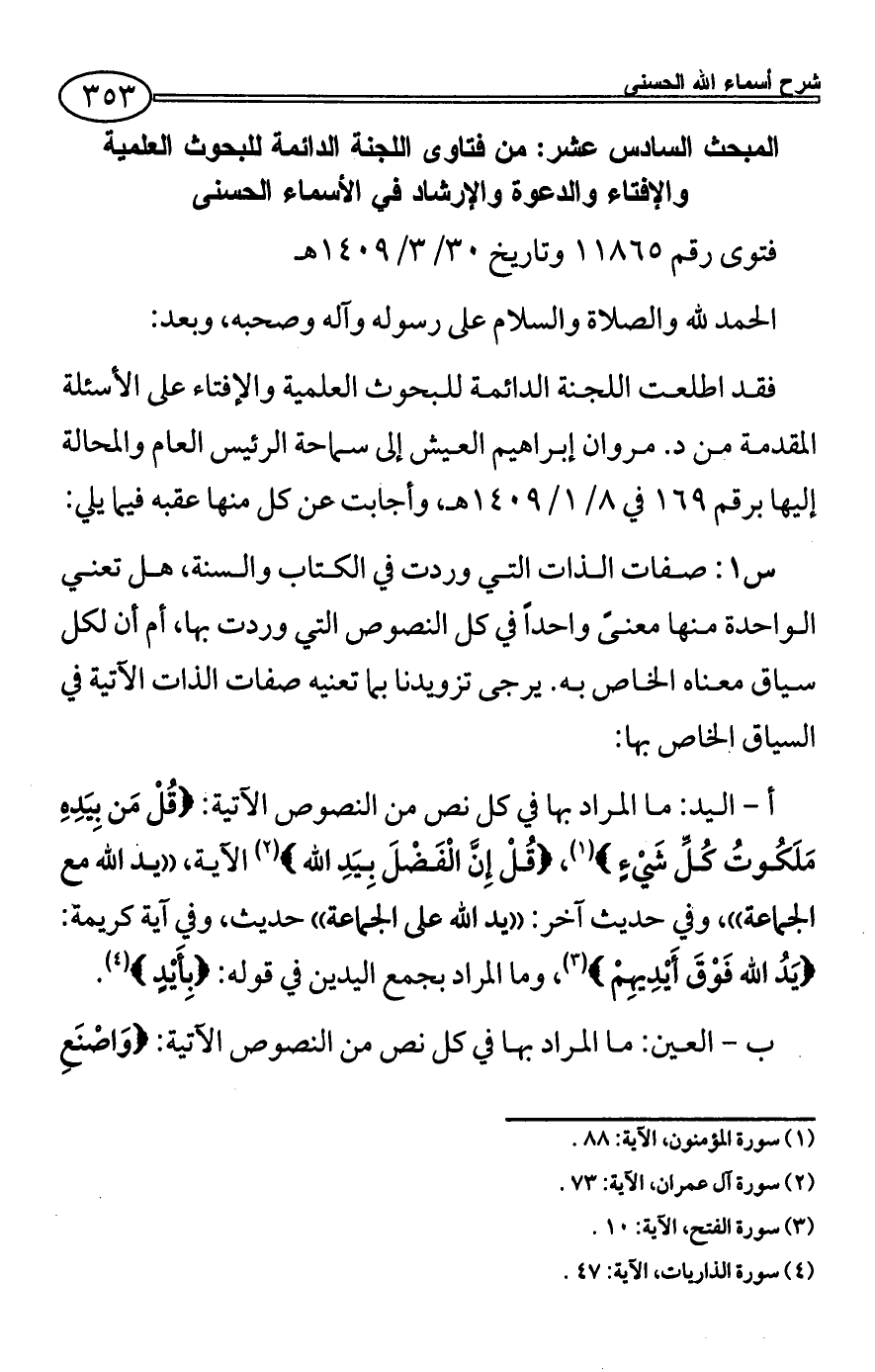 المبحث السادس عشر: من فتاوى اللجنة الدائمة للبحوث العلمية والإفتاء والدعوة والإرشاد في الأسماء الحسنى