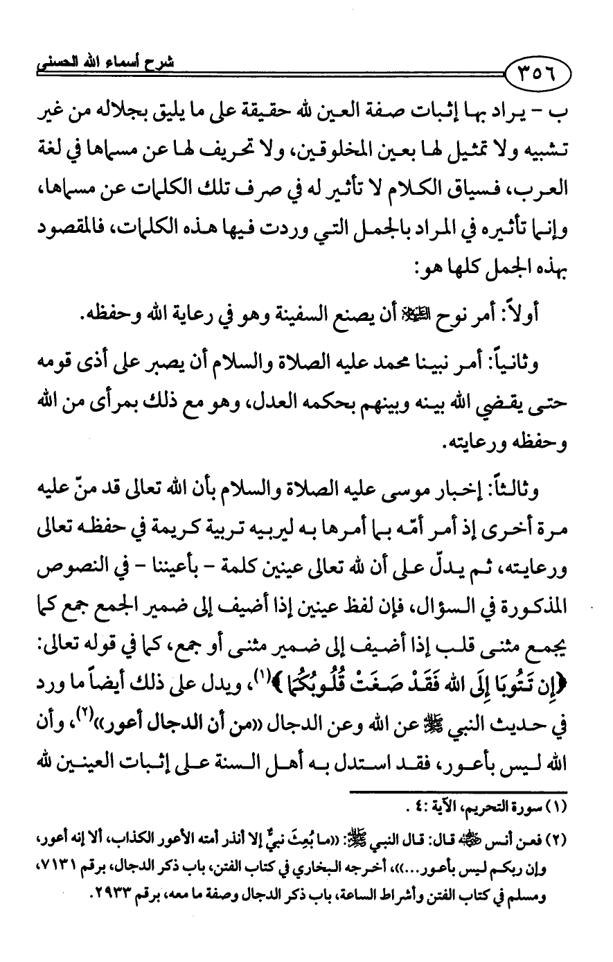 {إِن تَتُوبَا إِلَى الله فَقَدْ صَغَتْ قُلُوبُكُمَا} (¬1)، ويدل على ذلك أيضاً ما ورد في حديث النبي - صلى الله عليه وسلم - عن الله وعن الدجال ((من أن الدجال أعور)) (¬2)، وأن الله ليس بأعور، فقد استدل به أهل السنة على إثبات العينين لله