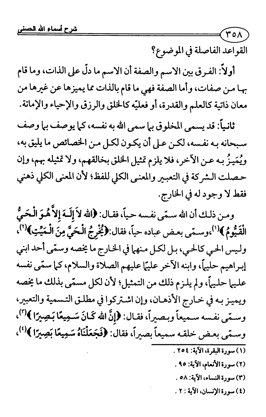 ومن ذلك أن الله سمّى نفسه حياً، فقال: {الله لاَ إِلَهَ إِلاَّ هُوَ الْحَيُّ الْقَيُّومُ} (¬1)،وسمّى بعض عباده حياً، فقال: {يُخْرِجُ الْحَيَّ مِنَ الْمَيِّتِ} (¬2)، وليس الحي كالحي، بل لكل منهما في الخارج ما يخصه وسمّى أحد ابني إبراهيم حليماً، وابنه الآخر عليمًا عليهم الصلاة والسلام، كما سمّى نفسه عليما حليماً، ولم يلزم ذلك من التمثيل؛ لأن لكل مسمّى بذلك ما يخصه ويميز به في خارج الأذهان، وإن اشتركوا في مطلق التسمية والتعبير، وسمّى نفسه سميعاً وبصيراً، فقال: {إِنَّ الله كَانَ سَمِيعًا بَصِيرًا} (¬3)، وسمّى بعض خلقه سميعاً بصيراً، فقال: {فَجَعَلْنَاهُ سَمِيعًا بَصِيرًا} (¬4)،