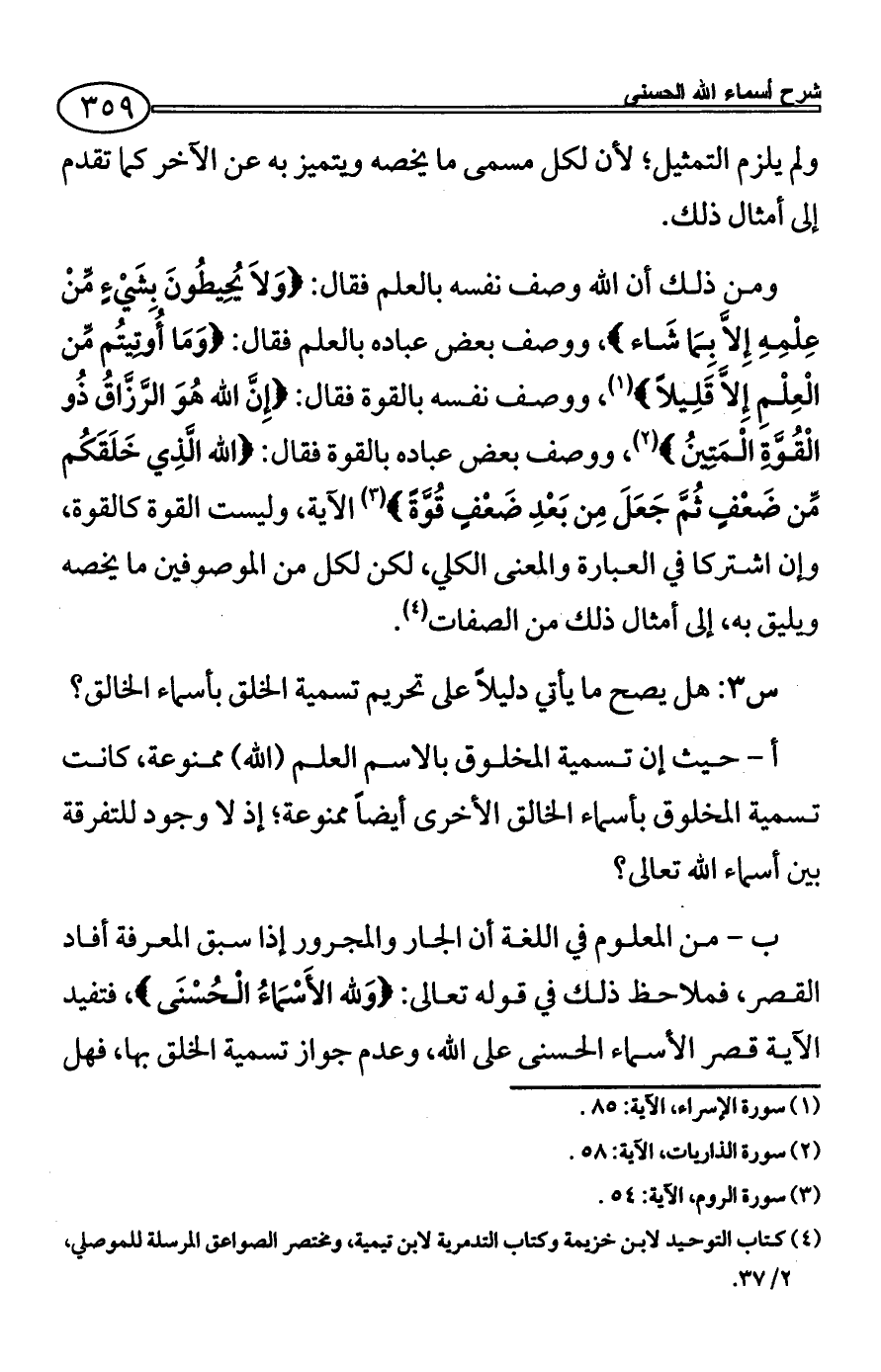 ومن ذلك أن الله وصف نفسه بالعلم فقال: {وَلاَ يُحِيطُونَ بِشَيْءٍ مِّنْ عِلْمِهِ إِلاَّ بِمَا شَاء}، ووصف بعض عباده بالعلم فقال: {وَمَا أُوتِيتُم مِّن الْعِلْمِ إِلاَّ قَلِيلاً} (¬1)، ووصف نفسه بالقوة فقال: {إِنَّ الله هُوَ الرَّزَّاقُ ذُو الْقُوَّةِ الْمَتِينُ} (¬2)، ووصف بعض عباده بالقوة فقال: {الله الَّذِي خَلَقَكُم مِّن ضَعْفٍ ثُمَّ جَعَلَ مِن بَعْدِ ضَعْفٍ قُوَّةً} (¬3) الآية، وليست القوة كالقوة، وإن اشتركا في العبارة والمعنى الكلي، لكن لكل من الموصوفين ما يخصه ويليق به، إلى أمثال ذلك من الصفات (¬4).
