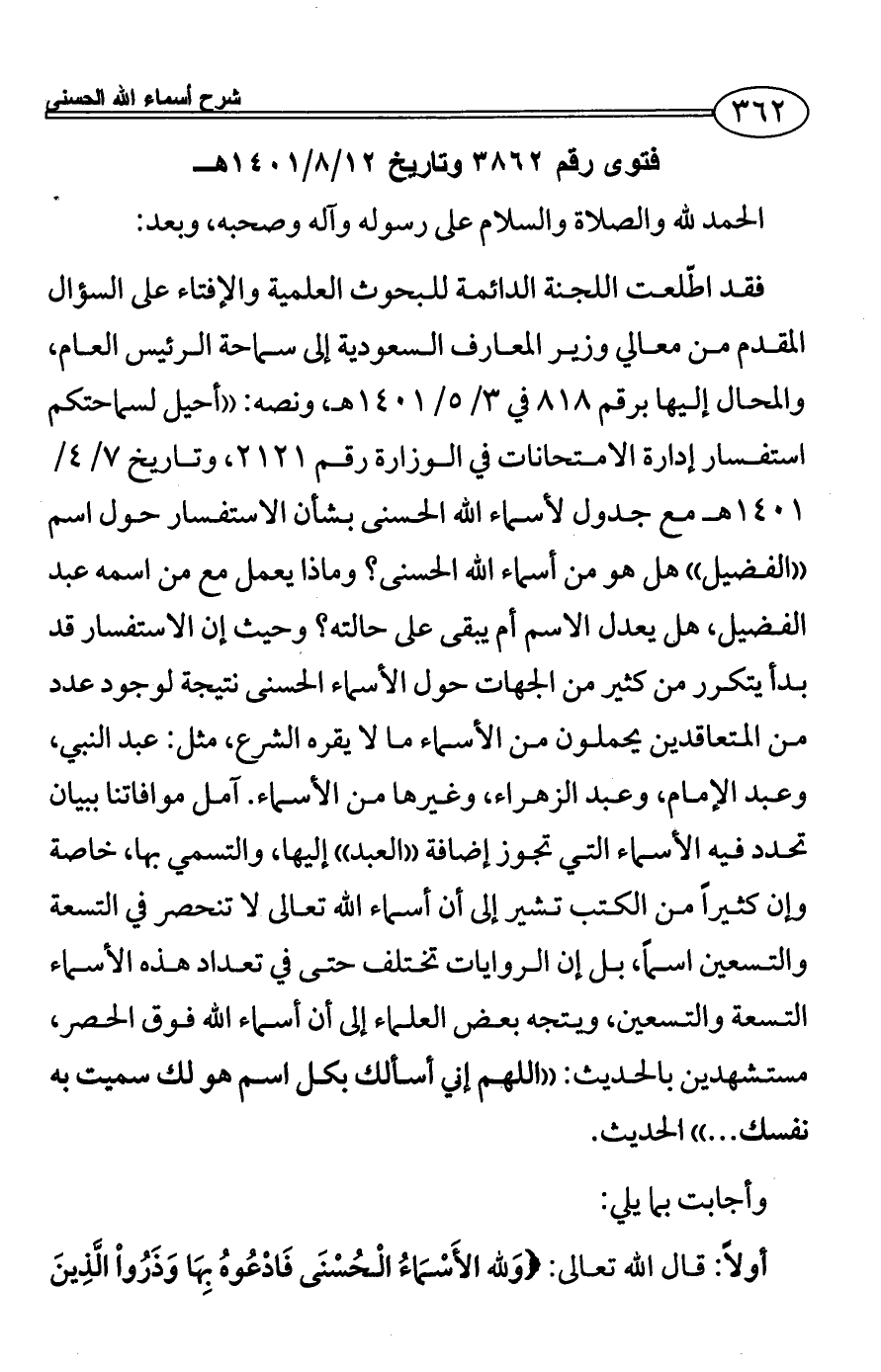 فقد اطّلعت اللجنة الدائمة للبحوث العلمية والإفتاء على السؤال المقدم من معالي وزير المعارف السعودية إلى سماحة الرئيس العام، والمحال إليها برقم 818 في 3/ 5/1401هـ، ونصه: ((أحيل لسماحتكم استفسار إدارة الامتحانات في الوزارة رقم 2121، وتاريخ 7/ 4/1401هـ مع جدول لأسماء الله الحسنى بشأن الاستفسار حول اسم ((الفضيل)) هل هو من أسماء الله الحسنى؟ وماذا يعمل مع من اسمه عبد الفضيل، هل يعدل الاسم أم يبقى على حالته؟ وحيث إن الاستفسار قد بدأ يتكرر من كثير من الجهات حول الأسماء الحسنى نتيجة لوجود عدد من المتعاقدين يحملون من الأسماء ما لا يقره الشرع، مثل: عبد النبي، وعبد الإمام، وعبد الزهراء، وغيرها من الأسماء. آمل موافاتنا ببيان تحدد فيه الأسماء التي تجوز إضافة ((العبد)) إليها، والتسمي بها، خاصة وإن كثيراً من الكتب تشير إلى أن أسماء الله تعالى لا تنحصر في التسعة والتسعين اسماً، بل إن الروايات تختلف حتى في تعداد هذه الأسماء التسعة والتسعين، ويتجه بعض العلماء إلى أن أسماء الله فوق الحصر، مستشهدين بالحديث: ((اللهم إني أسألك بكل اسم هو لك سميت به نفسك ... )) الحديث.