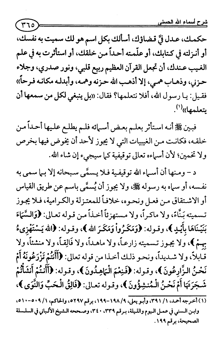 د - ومنها أن أسماء الله توقيفية فلا يسمَّى سبحانه إلا بما سمى به نفسه، أو سماه به رسوله - صلى الله عليه وسلم -، ولا يجوز أن يُسمَّى باسم عن طريق القياس أو الاشتقاق من فعل ونحوه، خلافاً للمعتزلة والكرامية، فلا يجوز تسميته بَنَّاءً، ولا ماكراً، ولا مستهزئاً أخذاً من قوله تعالى: {وَالسَّمَاءَ بَنَيْنَاهَا بِأَيْدٍ}، وقوله: {وَمَكَرُواْ وَمَكَرَ الله}، وقوله: {الله يَسْتَهْزِىءُ