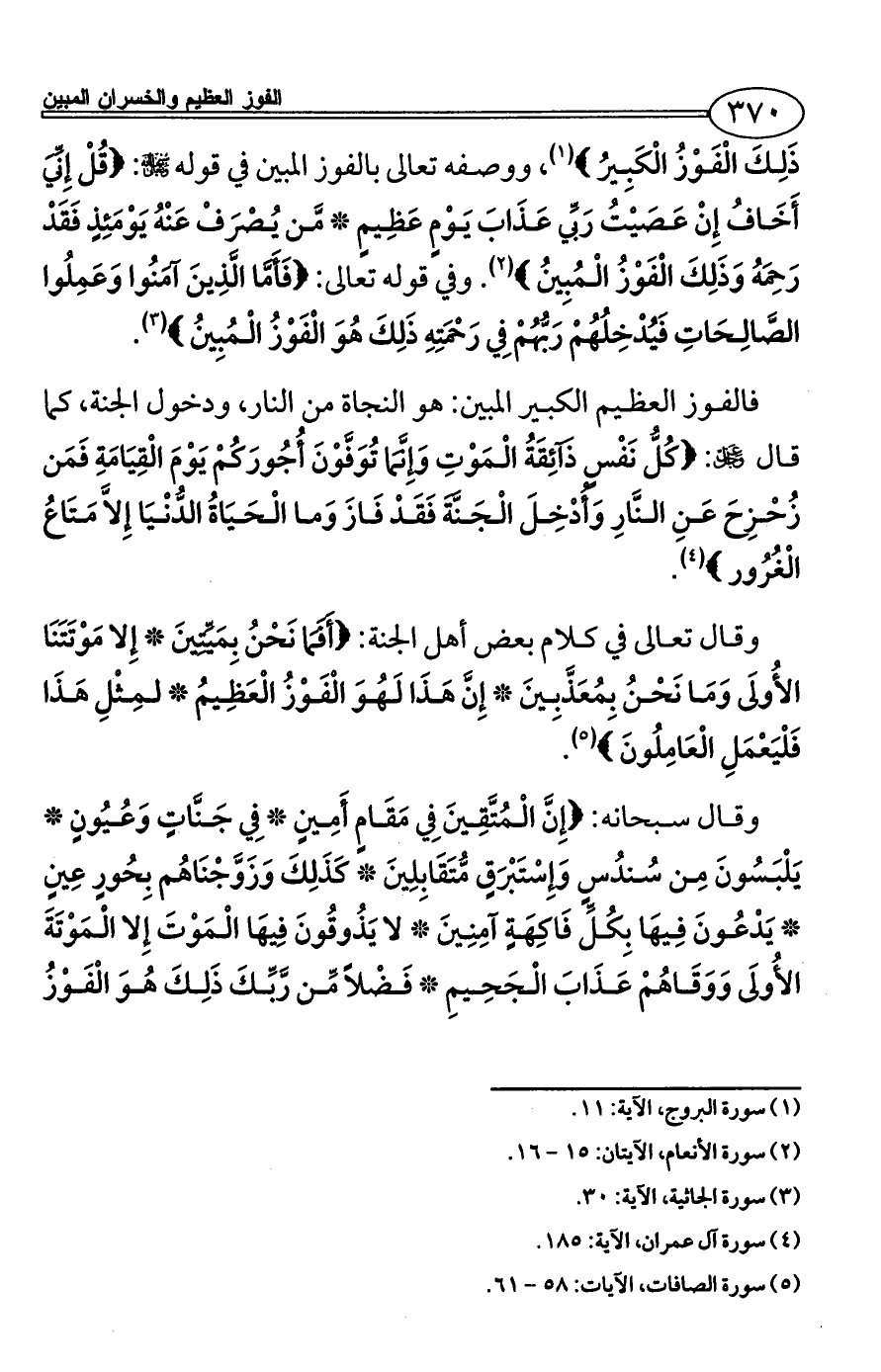 ذَلِكَ الْفَوْزُ الْكَبِيرُ} (¬1)، ووصفه تعالى بالفوز المبين في قوله - سبحانه وتعالى -: {قُلْ إِنِّيَ أَخَافُ إِنْ عَصَيْتُ رَبِّي عَذَابَ يَوْمٍ عَظِيمٍ * مَّن يُصْرَفْ عَنْهُ يَوْمَئِذٍ فَقَدْ رَحِمَهُ وَذَلِكَ الْفَوْزُ الْمُبِينُ} (¬2). وفي قوله تعالى: {فَأَمَّا الَّذِينَ آمَنُوا وَعَمِلُوا الصَّالِحَاتِ فَيُدْخِلُهُمْ رَبُّهُمْ فِي رَحْمَتِهِ ذَلِكَ هُوَ الْفَوْزُ الْمُبِينُ} (¬3).