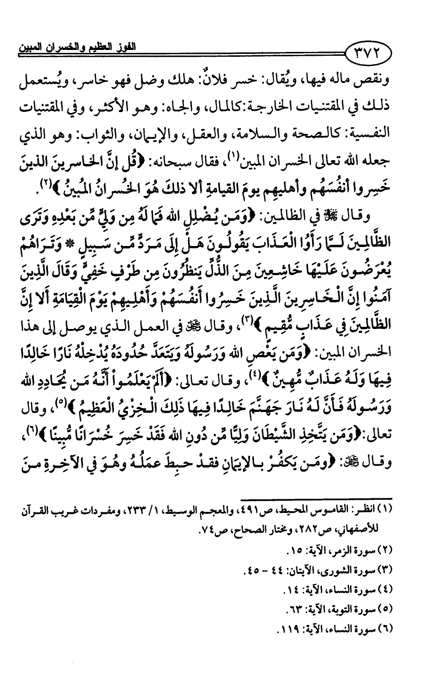 ونقص ماله فيها، ويُقال: خسر فلانٌ: هلك وضل فهو خاسر، ويُستعمل ذلك في المقتنيات الخارجة: كالمال، والجاه: وهو الأكثر، وفي المقتنيات النفسية: كالصحة والسلامة، والعقل، والإيمان، والثواب: وهو الذي جعله الله تعالى الخسران المبين (¬1)، فقال سبحانه: {قُل إنَّ الخاسرينَ الذينَ خَسِروا أنفُسَهُم وأهليهِم يومَ القيامةِ ألا ذلكَ هُوَ الخُسرانُ المُبينُ} (¬2).