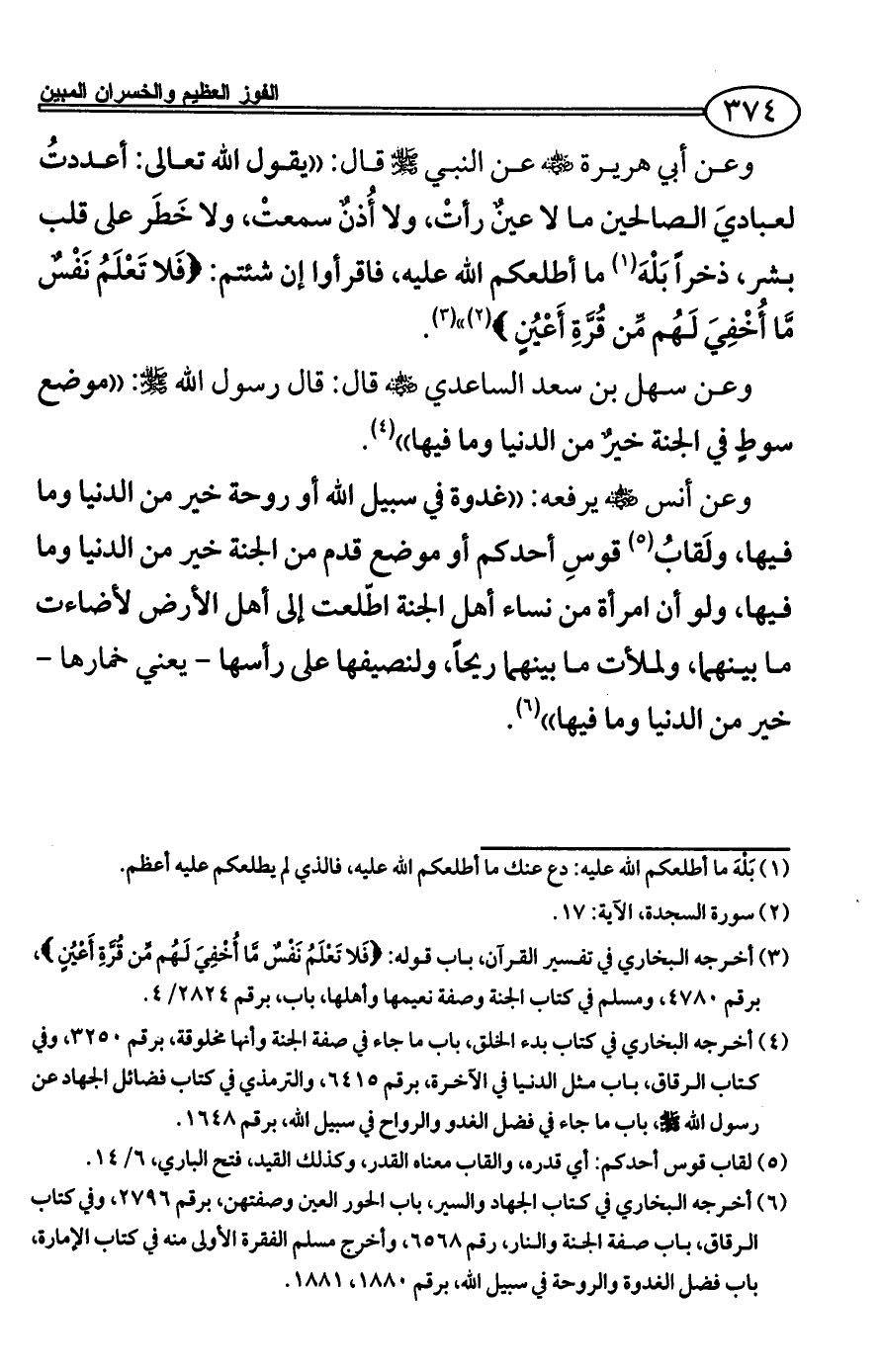(¬3) أخرجه البخاري في تفسير القرآن، باب قوله: {فَلا تَعْلَمُ نَفْسٌ مَّا أُخْفِيَ لَهُم مِّن قُرَّةِ أَعْيُنٍ}، برقم 4780، ومسلم في كتاب الجنة وصفة نعيمها وأهلها، باب، برقم 2824/ 4.