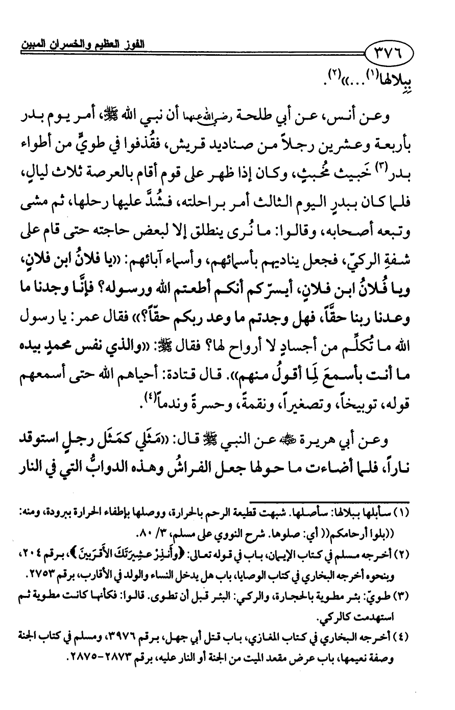 (¬4) أخرجه البخاري في كتاب المغازي، باب قتل أبي جهل، برقم 3976، ومسلم في كتاب الجنة وصفة نعيمها، باب عرض مقعد الميت من الجنة أو النار عليه، برقم 2873 - 2875.