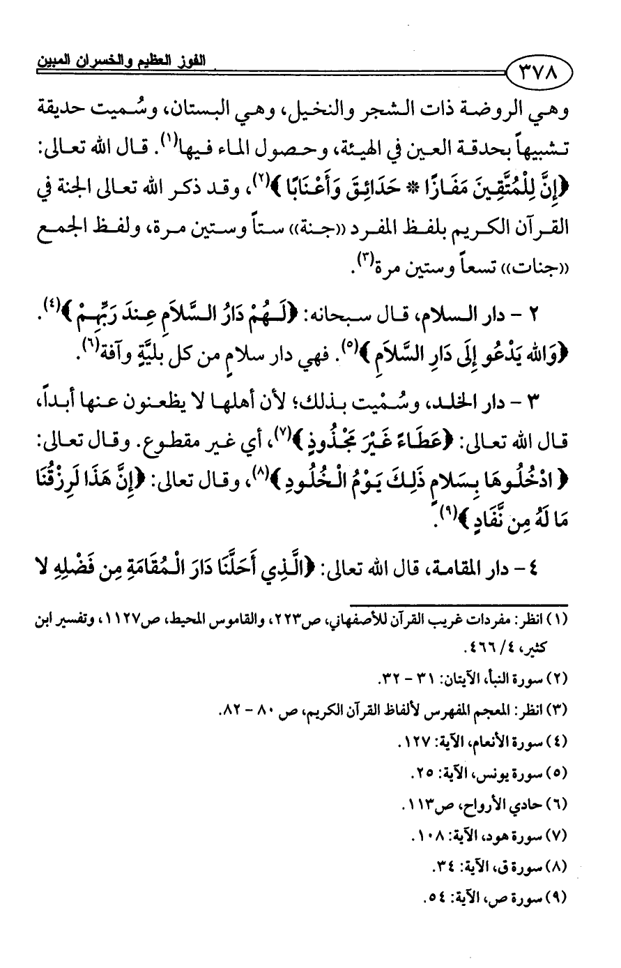 {إِنَّ لِلْمُتَّقِينَ مَفَازًا * حَدَائِقَ وَأَعْنَابًا} (¬2)، وقد ذكر الله تعالى الجنة في القرآن الكريم بلفظ المفرد ((جنة)) ستاً وستين مرة، ولفظ الجمع ((جنات)) تسعاً وستين مرة (¬3).