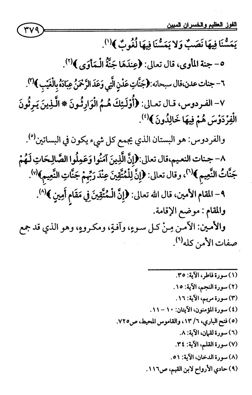 8 - جنات النعيم، قال تعالى: {إِنَّ الَّذِينَ آمَنُوا وَعَمِلُوا الصَّالِحَاتِ لَهُمْ جَنَّاتُ النَّعِيمِ} (¬6)، وقال تعالى: {إِنَّ لِلْمُتَّقِينَ عِنْدَ رَبِّهِمْ جَنَّاتِ النَّعِيمِ} (¬7).