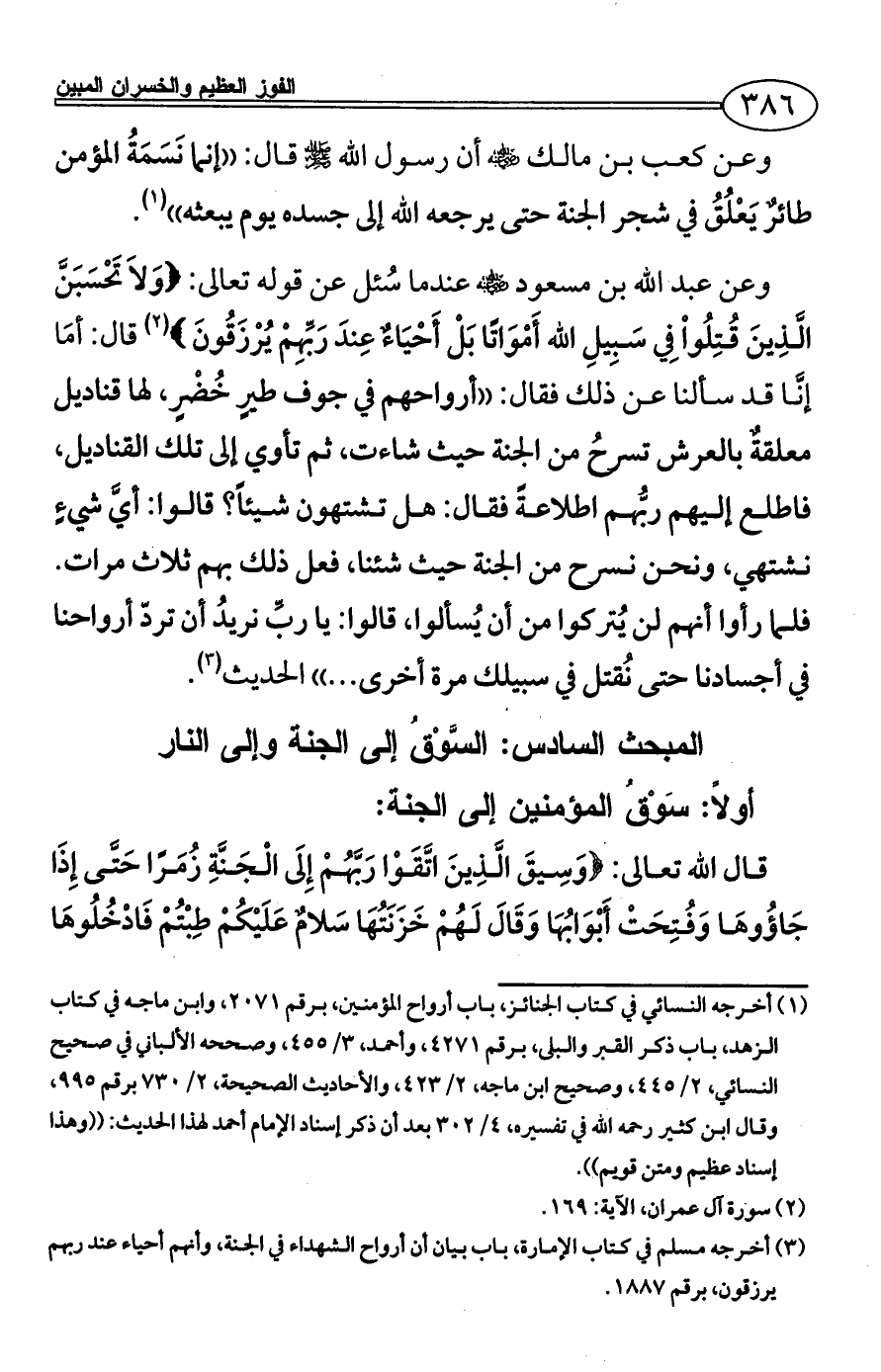 (¬1) أخرجه النسائي في كتاب الجنائز، باب أرواح المؤمنين، برقم 2071، وابن ماجه في كتاب الزهد، باب ذكر القبر والبلى، برقم 4271، وأحمد، 3/ 455، وصححه الألباني في صحيح النسائي، 2/ 445، وصحيح ابن ماجه، 2/ 423، والأحاديث الصحيحة، 2/ 730 برقم 995، وقال ابن كثير رحمه الله في تفسيره، 4/ 302 بعد أن ذكر إسناد الإمام أحمد لهذا الحديث: ((وهذا إسناد عظيم ومتن قويم)).