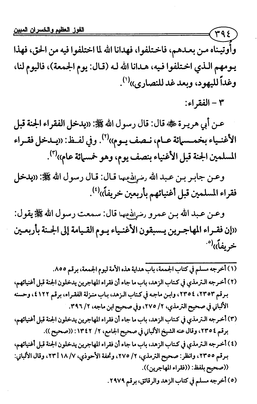 (¬3) أخرجه الترمذي في كتاب الزهد، باب ما جاء أن فقراء المهاجرين يدخلون الجنة قبل أغنيائهم، برقم 2354، وقال عنه الشيخ الألباني في صحيح الجامع، 2/ 1342: ((صحيح)).